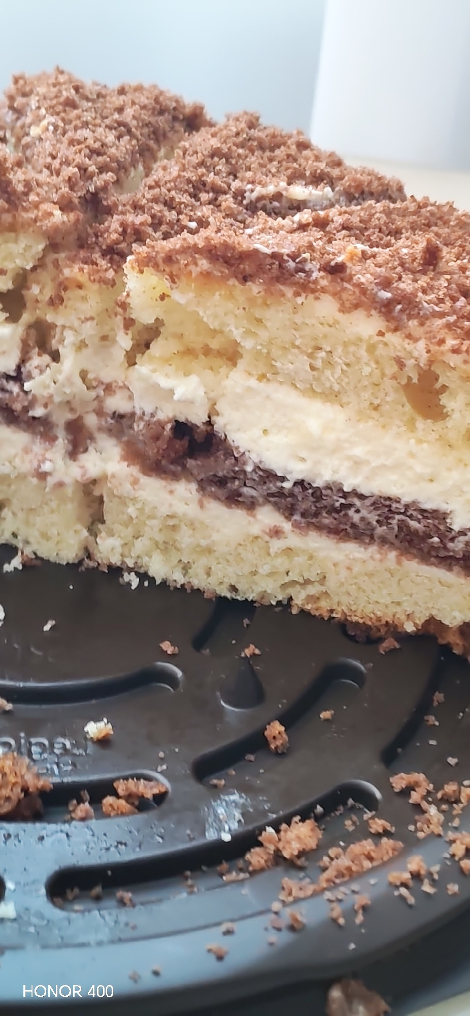 A close-up shot reveals a slice of layered cake on a dark grey cake plate. The cake has a yellow sponge base and top, separated by a layer of white cream filling and a thin layer of chocolate filling…read more