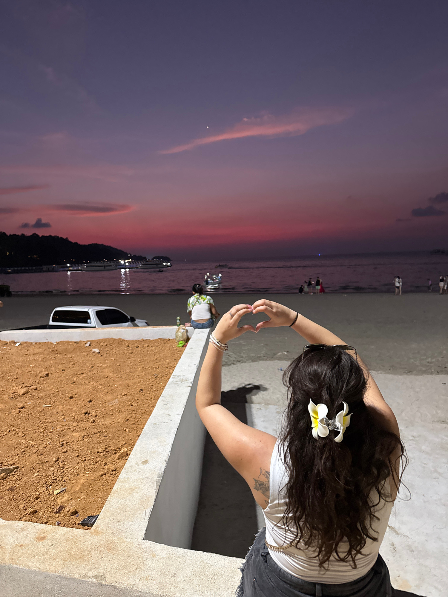 A medium, eye-level shot depicts a woman on a concrete walkway in Patong, Thailand, making a heart shape with her hands against a sunset backdrop. The woman, wearing a white top, dark shorts, and a pl…read more