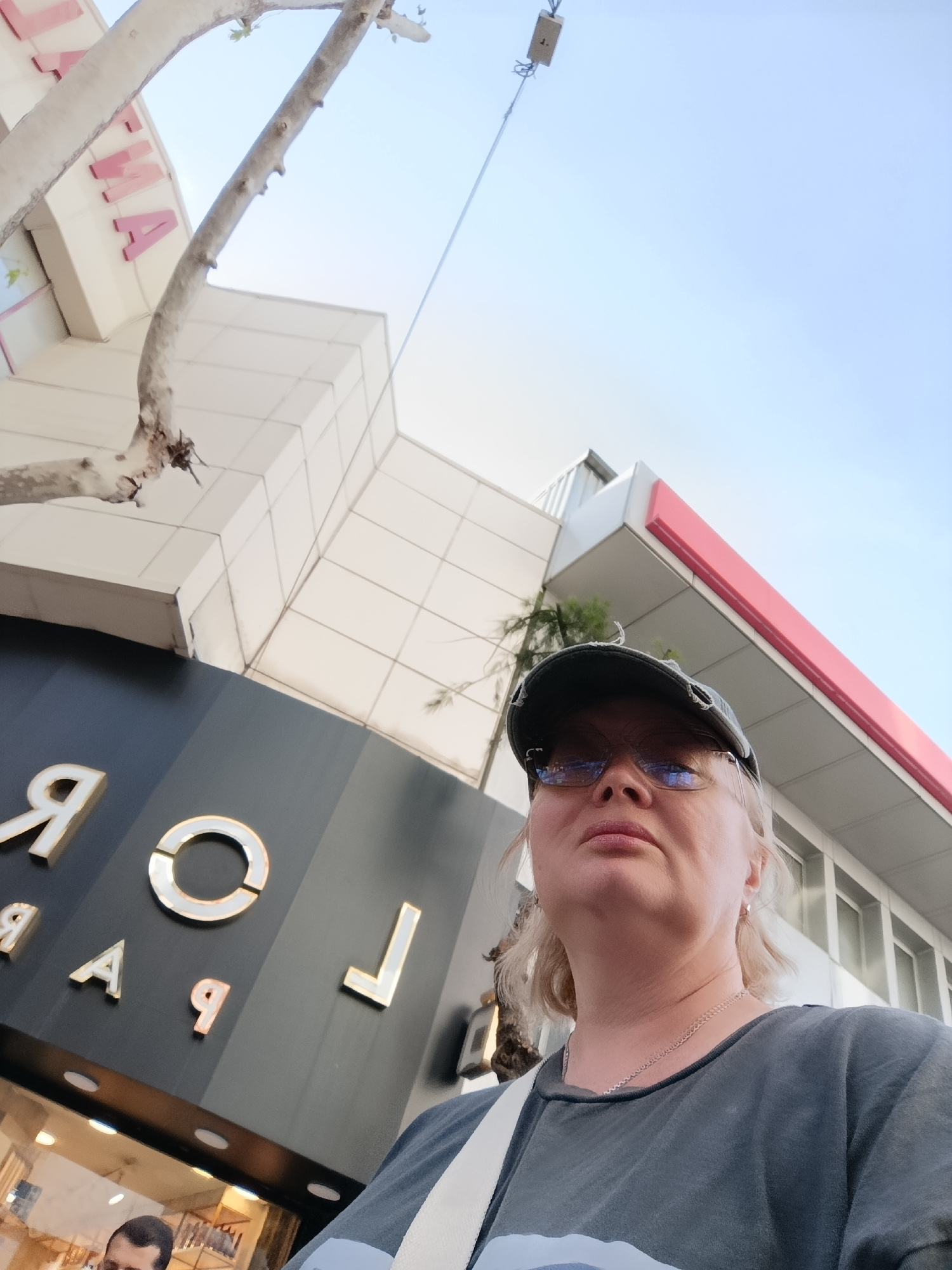 A low-angle photograph captures a fair-skinned woman wearing a dark-colored baseball cap, glasses, a grey t-shirt, and a silver necklace. A white strap of what appears to be a bag is visible across he…read more