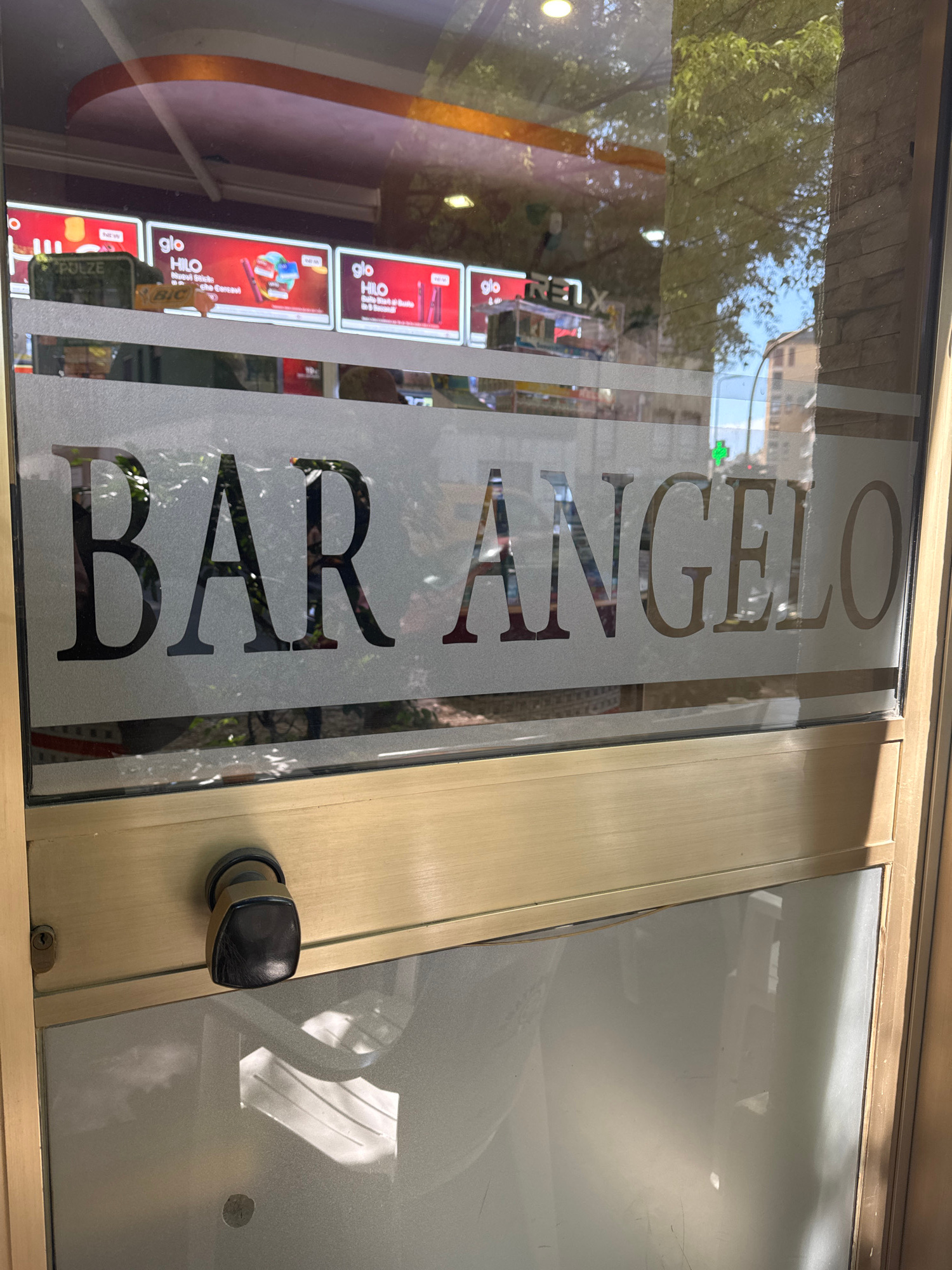 A storefront in Milan, Italy displays the words "BAR ANGELO" vertically on its glass entrance door. The door also features a black, rounded handle. The glass door is set within a gold-colored frame. T…read more