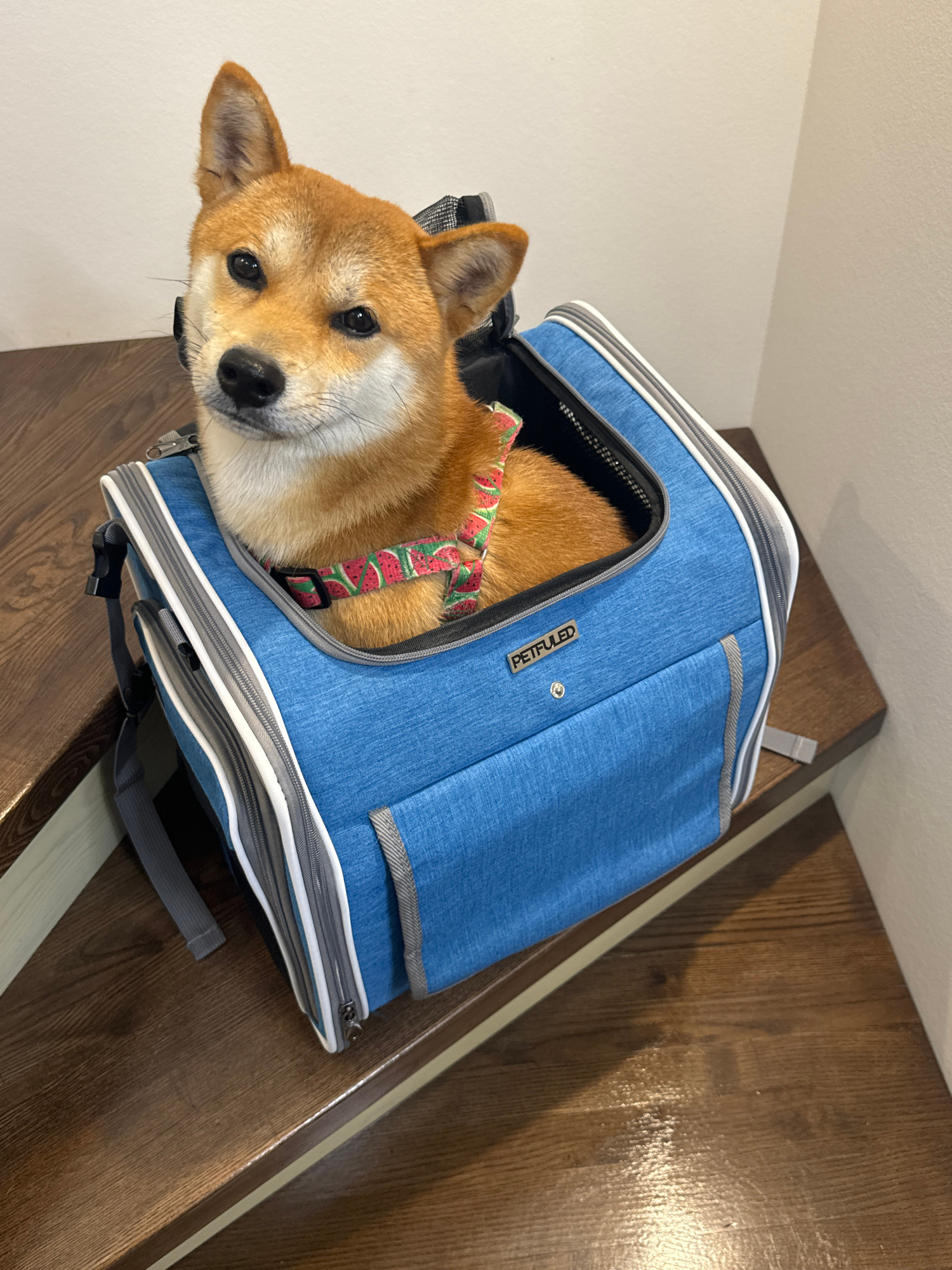 A Shiba Inu dog with reddish-brown and white fur is pictured peeking out from a blue, soft-sided pet carrier. The dog's head and upper body are visible through an open section of the carrier, and it l…read more