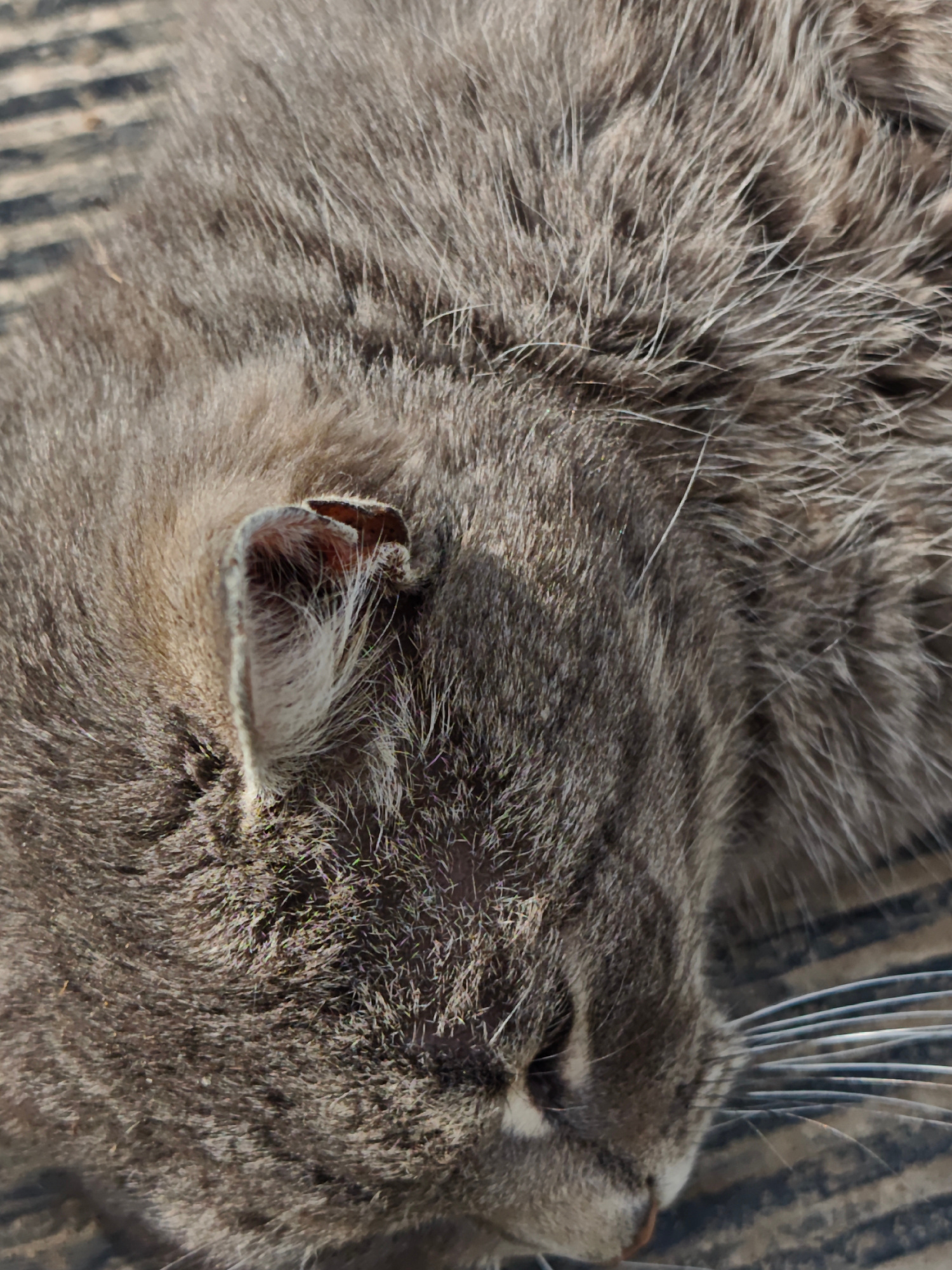 The image depicts a close-up view of a grey cat sleeping. The focus is on the cat's head and upper body. Its fur appears dense and somewhat rough, with a mix of grey and white hairs. The cat's ear is…read more