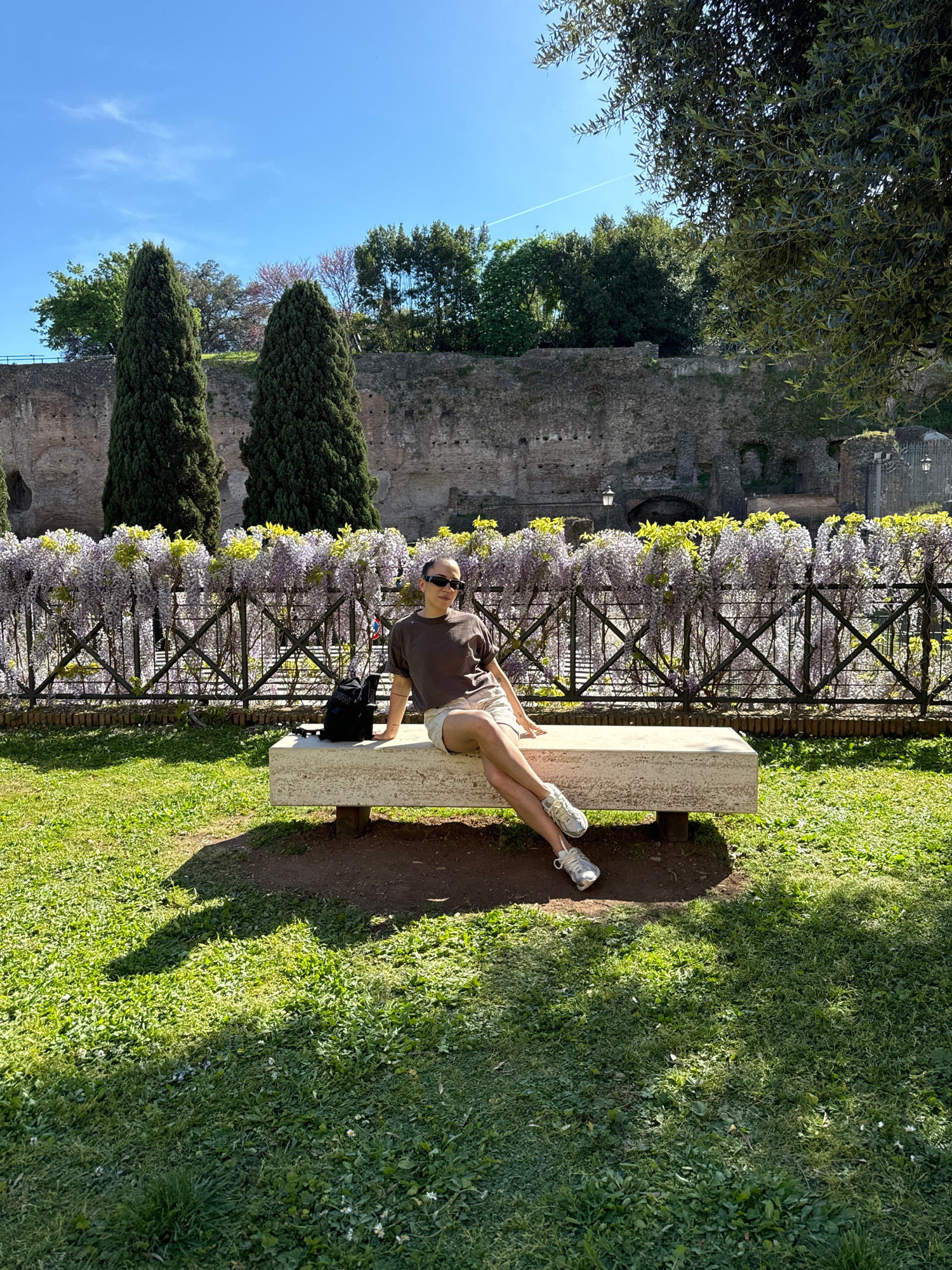 A woman rests on a light stone bench on a patch of bright green grass next to a wrought iron fence that is covered in flowering wisteria. Behind the fence is a crumbling stone wall with trees growing…read more