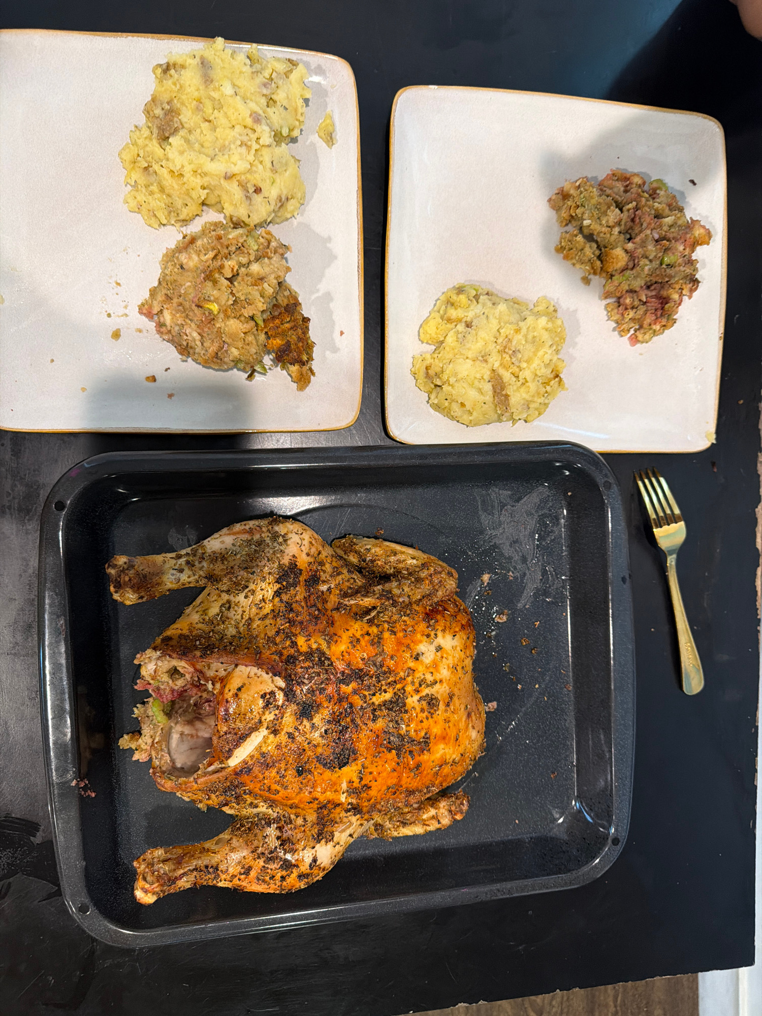 The image shows a cooked chicken in a black baking pan, a gold fork, and two plates with mashed potatoes and stuffing. The plates are white with a gold trim. The food is arranged on a black surface. T…read more