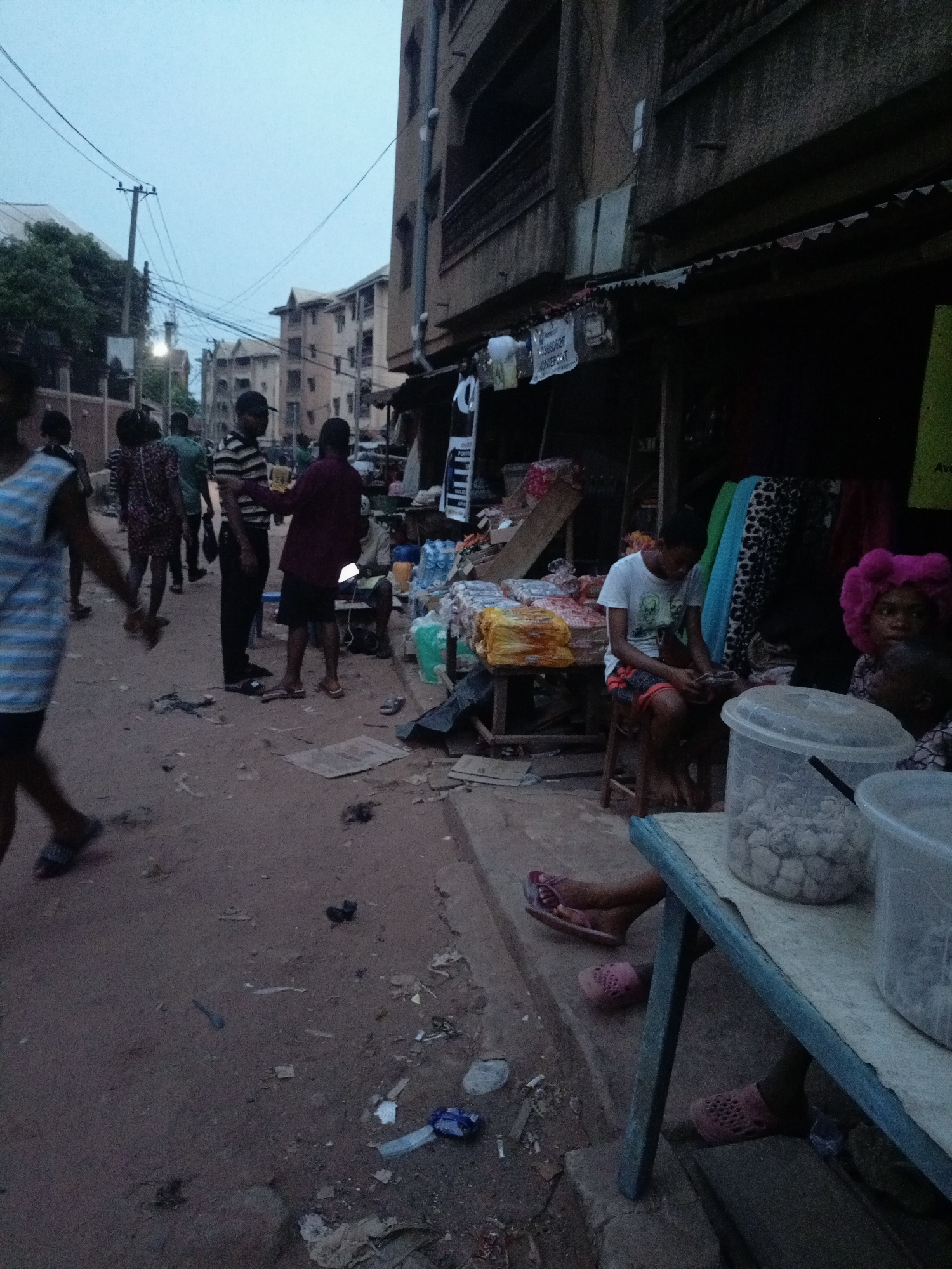 The image depicts a street scene in Onitsha, Nigeria. The environment is urban, with multi-story buildings lining a dirt road. Litter and debris are scattered on the ground. Several people are present…read more