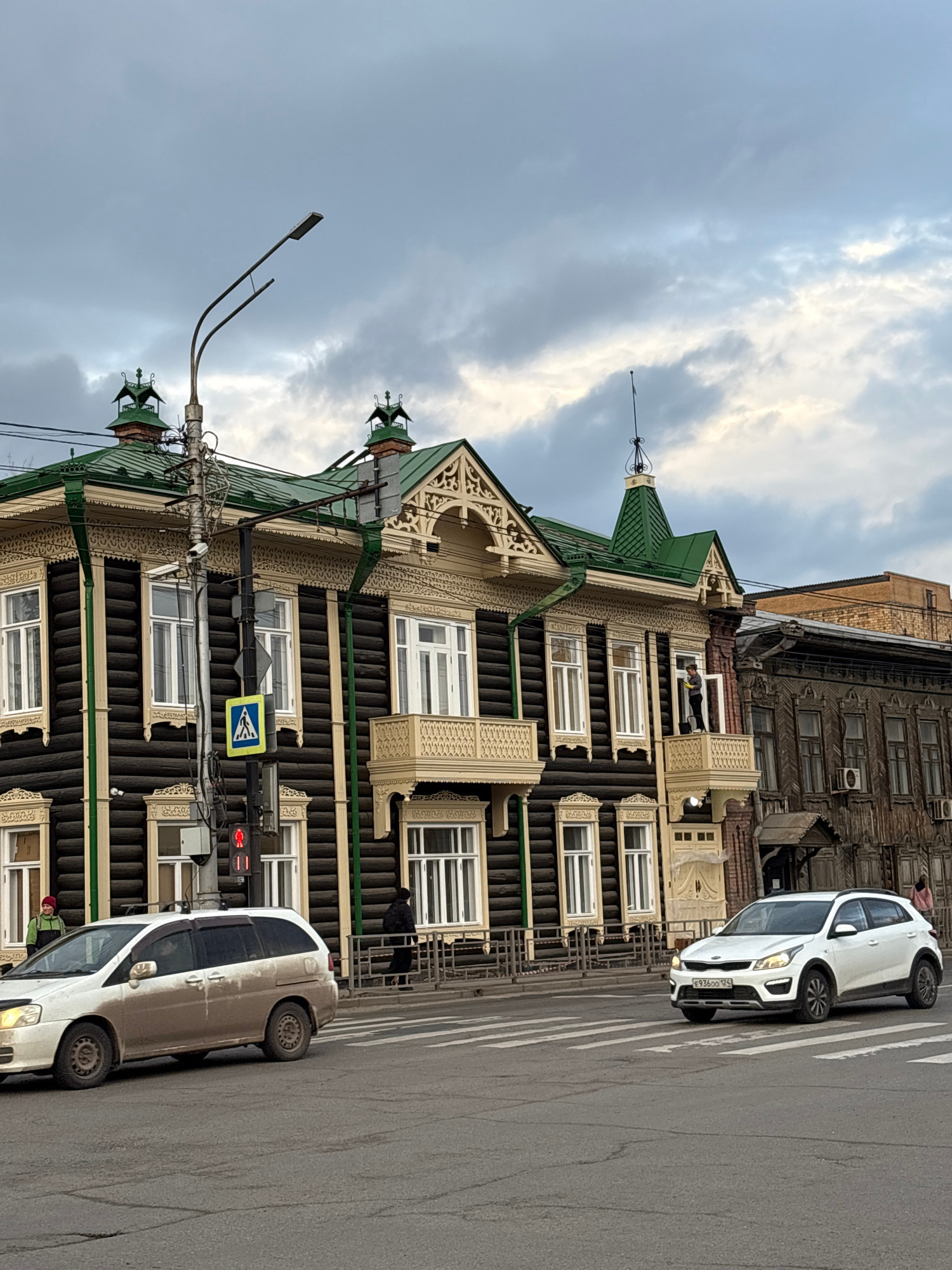 A street scene in Krasnoyarsk, Russia. A two-story wooden building with intricate carved details and a green roof is positioned beside the street. The building has a pedestrian crossing sign and a tra…read more