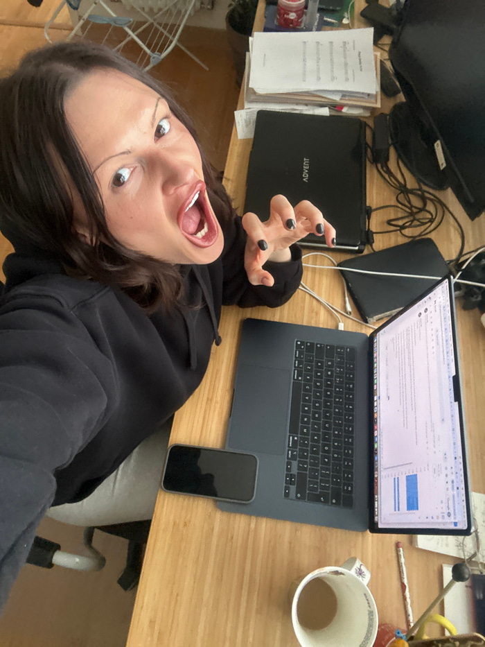 This image depicts a single female subject positioned at a wooden desk in an indoor setting, identified as a location within Tunbridge Wells, United Kingdom. The female, with dark hair, is wearing a b…read more