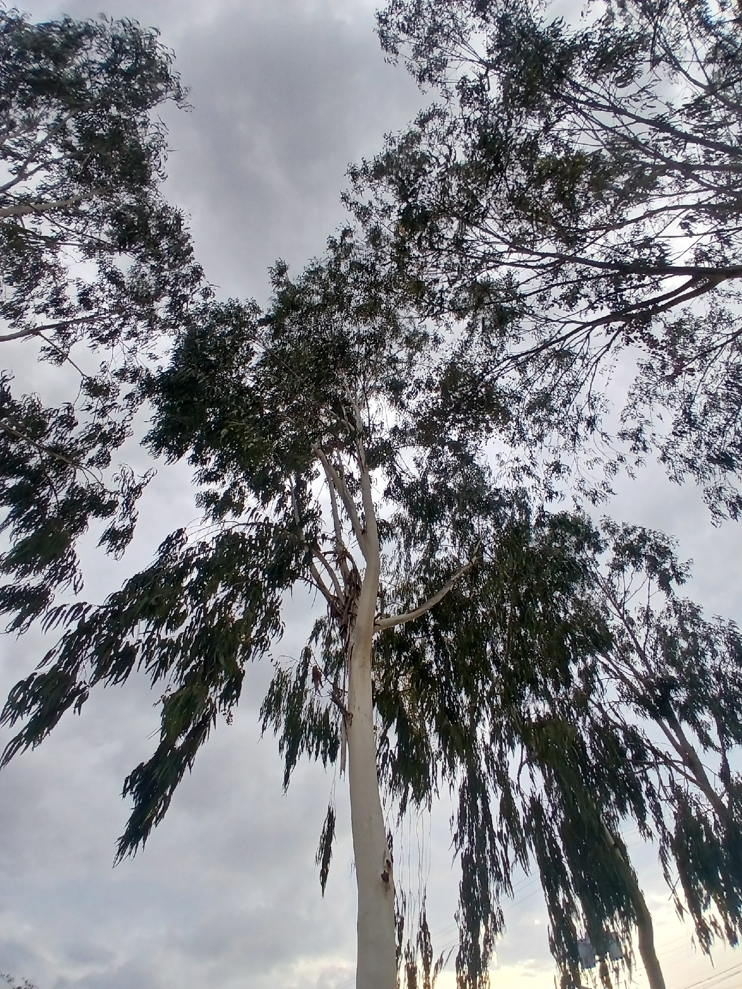 This is a low-angle photograph of trees with a cloudy sky as the background. The trees are characterized by their thin, elongated leaves and slender branches. The trunk of a prominent tree in the cent…read more