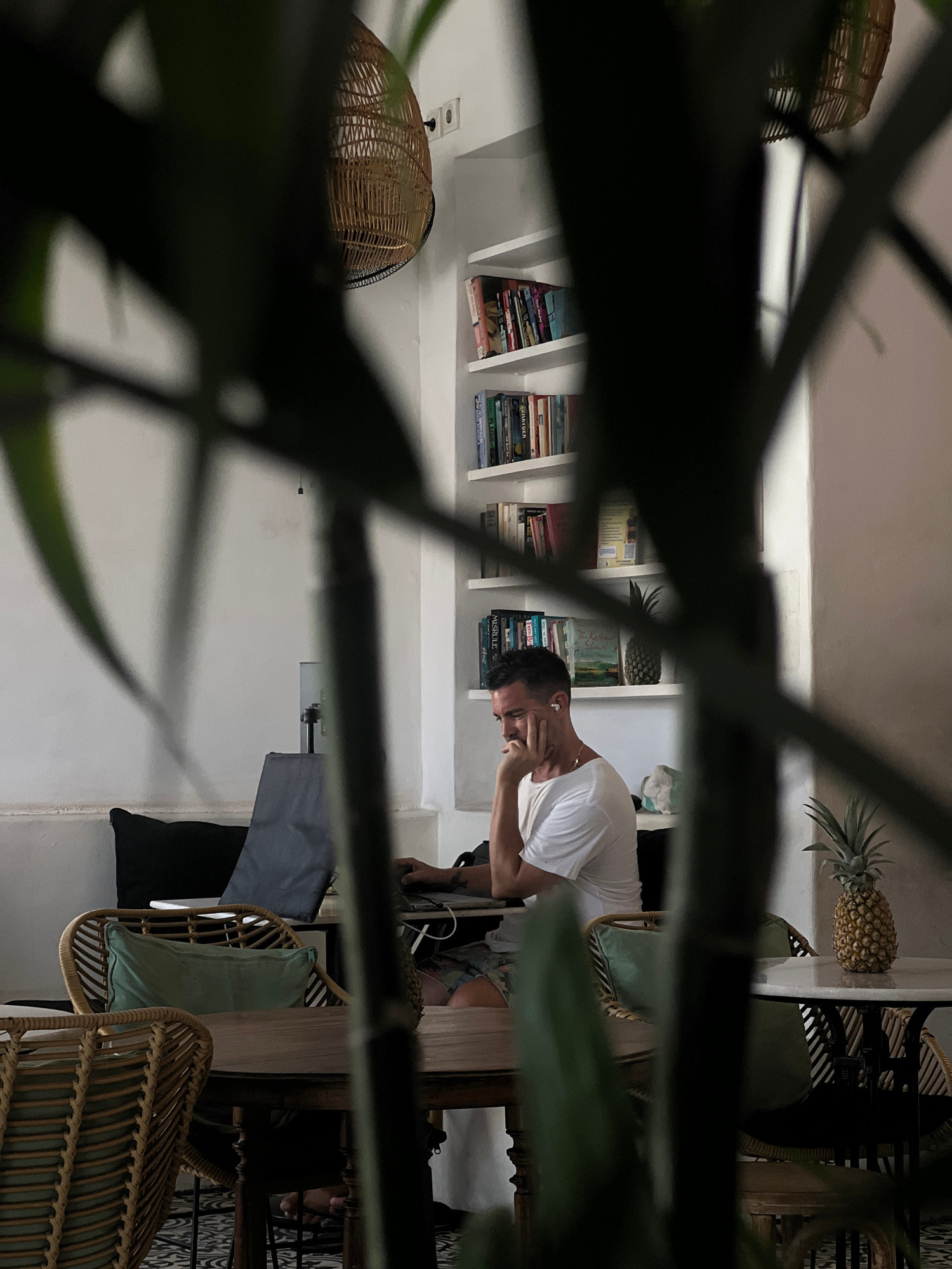 A slightly overexposed, high-angle shot, taken from the inside of a building in North Kuta, Indonesia, looks across the interior of a restaurant or cafe. The angle is awkward, with a large plant in th…read more