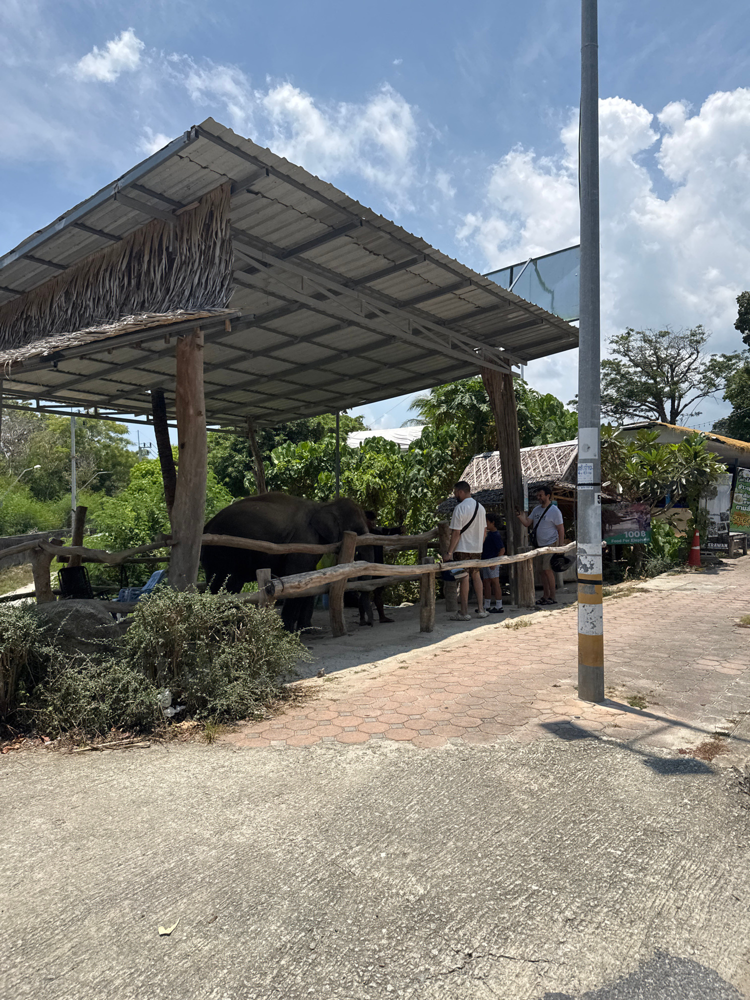 The image depicts a scene in Patong, Thailand, featuring an elephant standing within a wooden enclosure with a corrugated metal roof. A group of people are seen standing adjacent to the enclosure, obs…read more