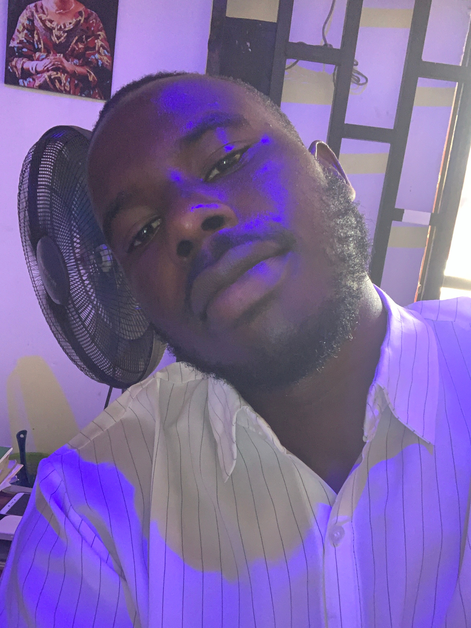 An indoor portrait captures a dark-skinned man, possibly in Jos, Nigeria, looking directly at the camera. The image is rotated 90 degrees counter-clockwise. He has a beard and short, dark, curly hair.…read more