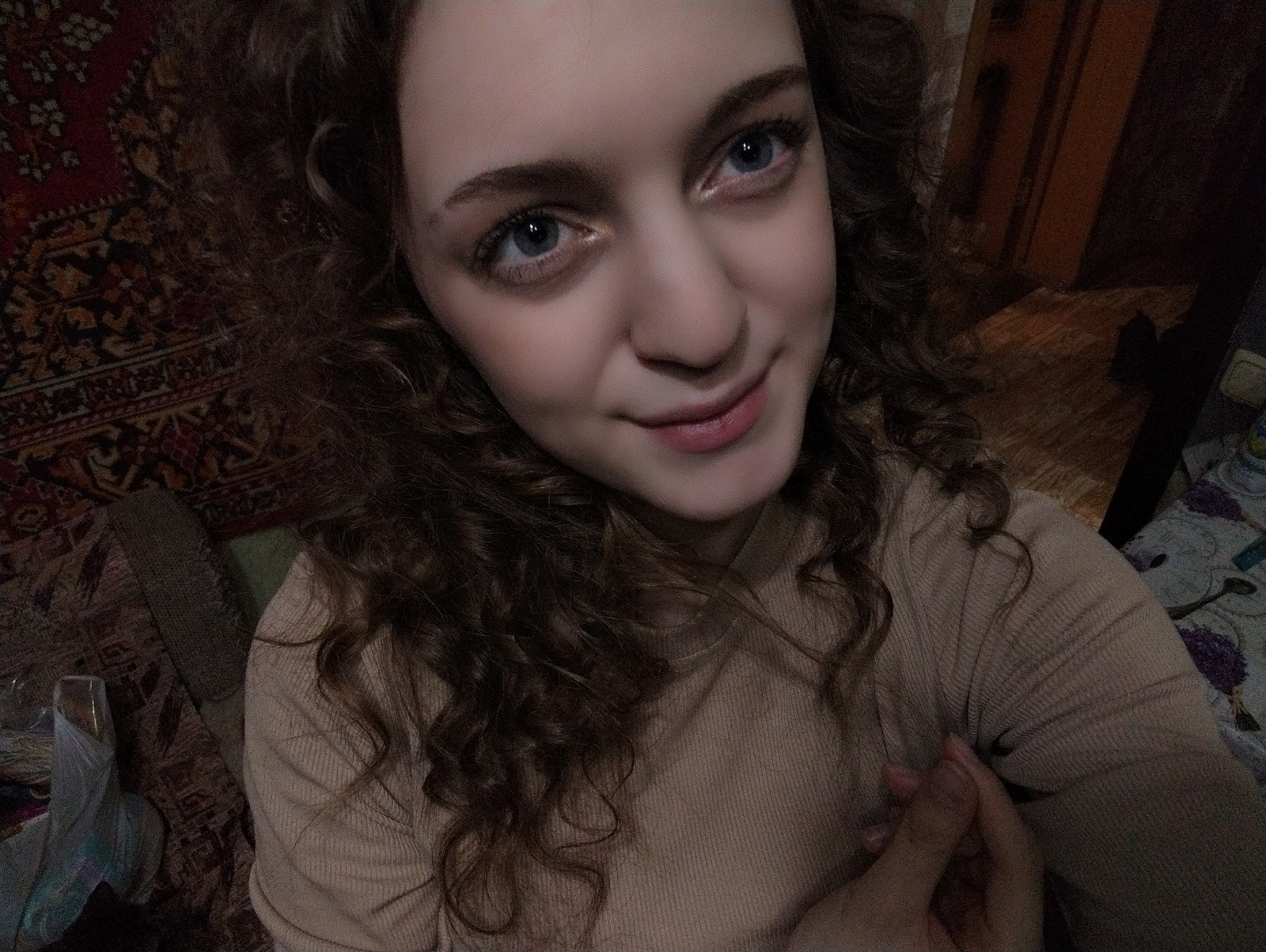 A young woman with curly brown hair and blue eyes is taking a selfie. She is wearing a beige sweater. In the background, there is a rug with a dark red and brown pattern. The location may be an apartm…read more