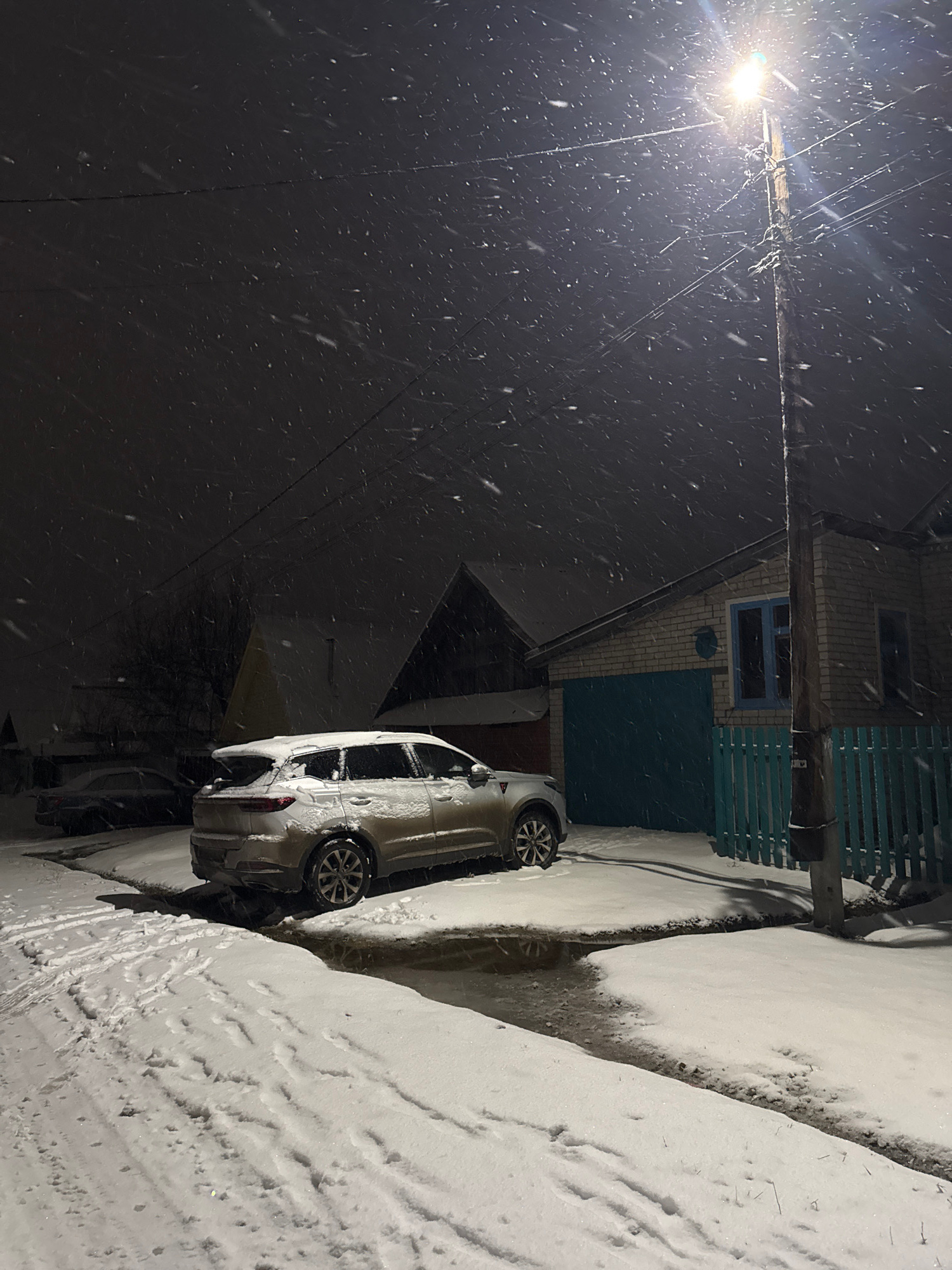 The image shows a snowy street scene at night in Chaikovsky, Russia. A street lamp illuminates the area, casting light on falling snow. A white car is parked along the right side of the street, partia…read more