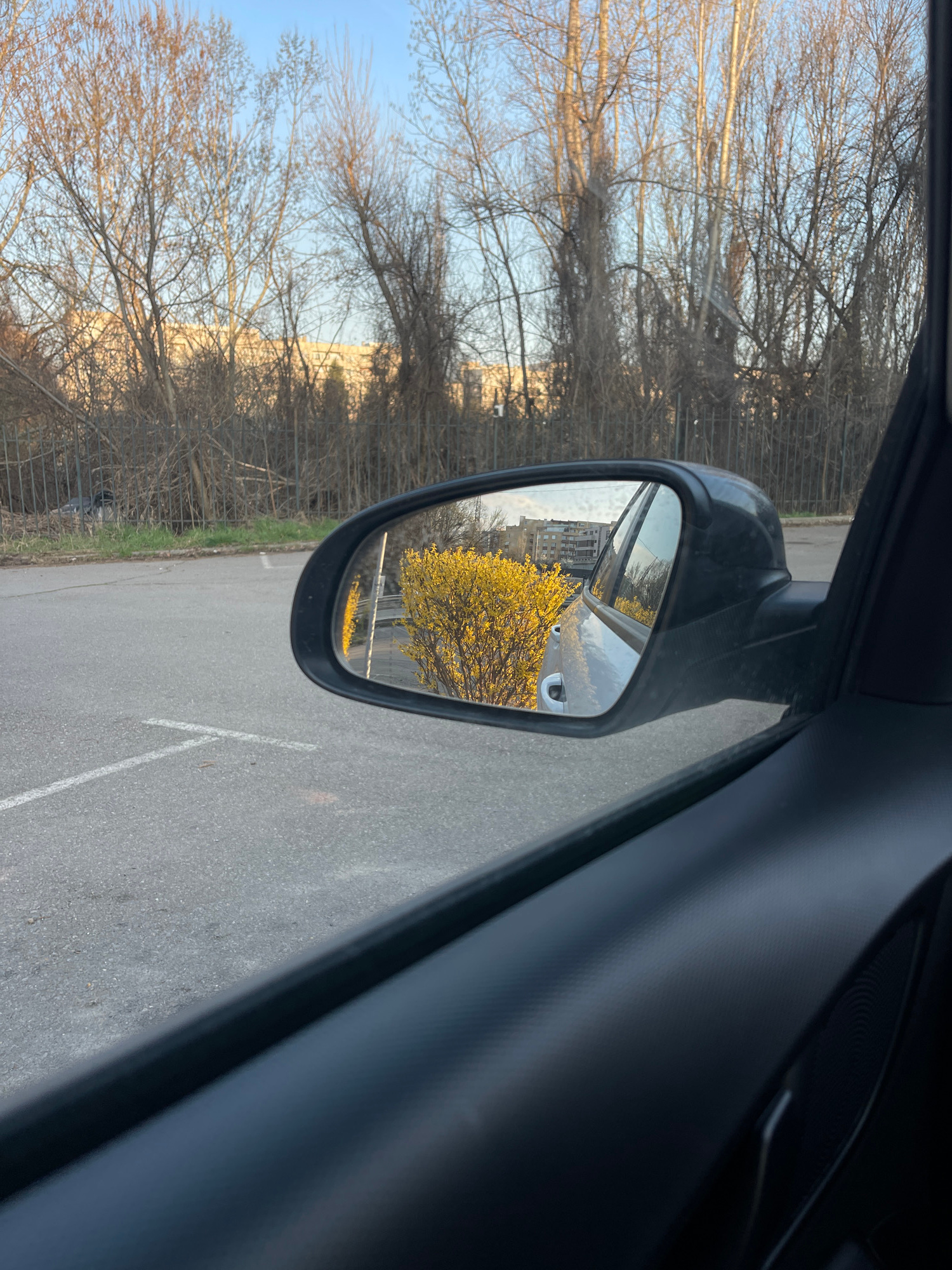 The image shows a view from inside a car, looking out through the side mirror. The side mirror reflects a scene of a parking lot with white parking lines. A tree with bright yellow flowers and a tall…read more