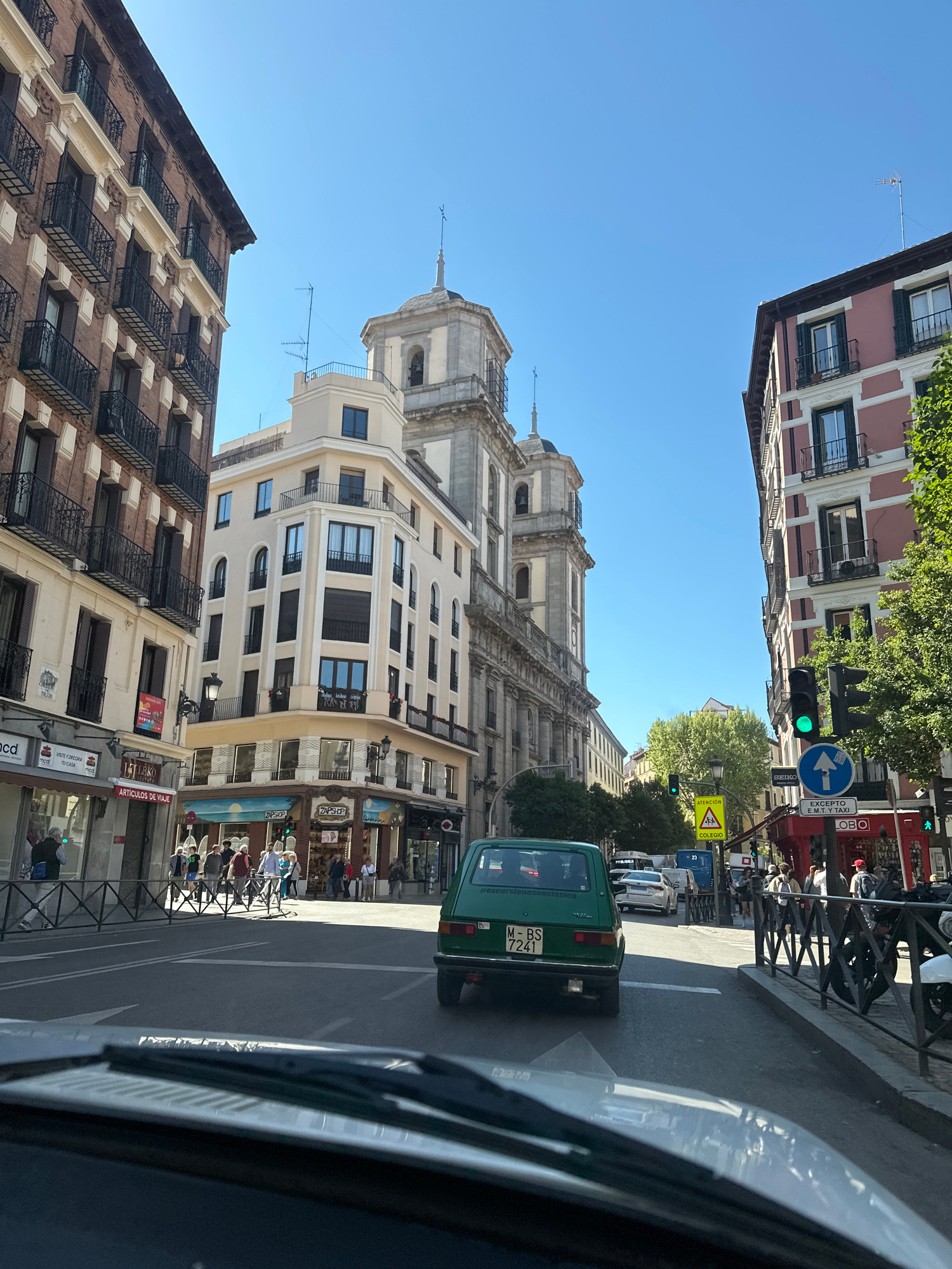 This vibrant street scene, set in Madrid, Spain, captures a bustling daytime environment under a clear blue sky. The image looks down a city street lined with multi-story buildings, featuring both cla…read more