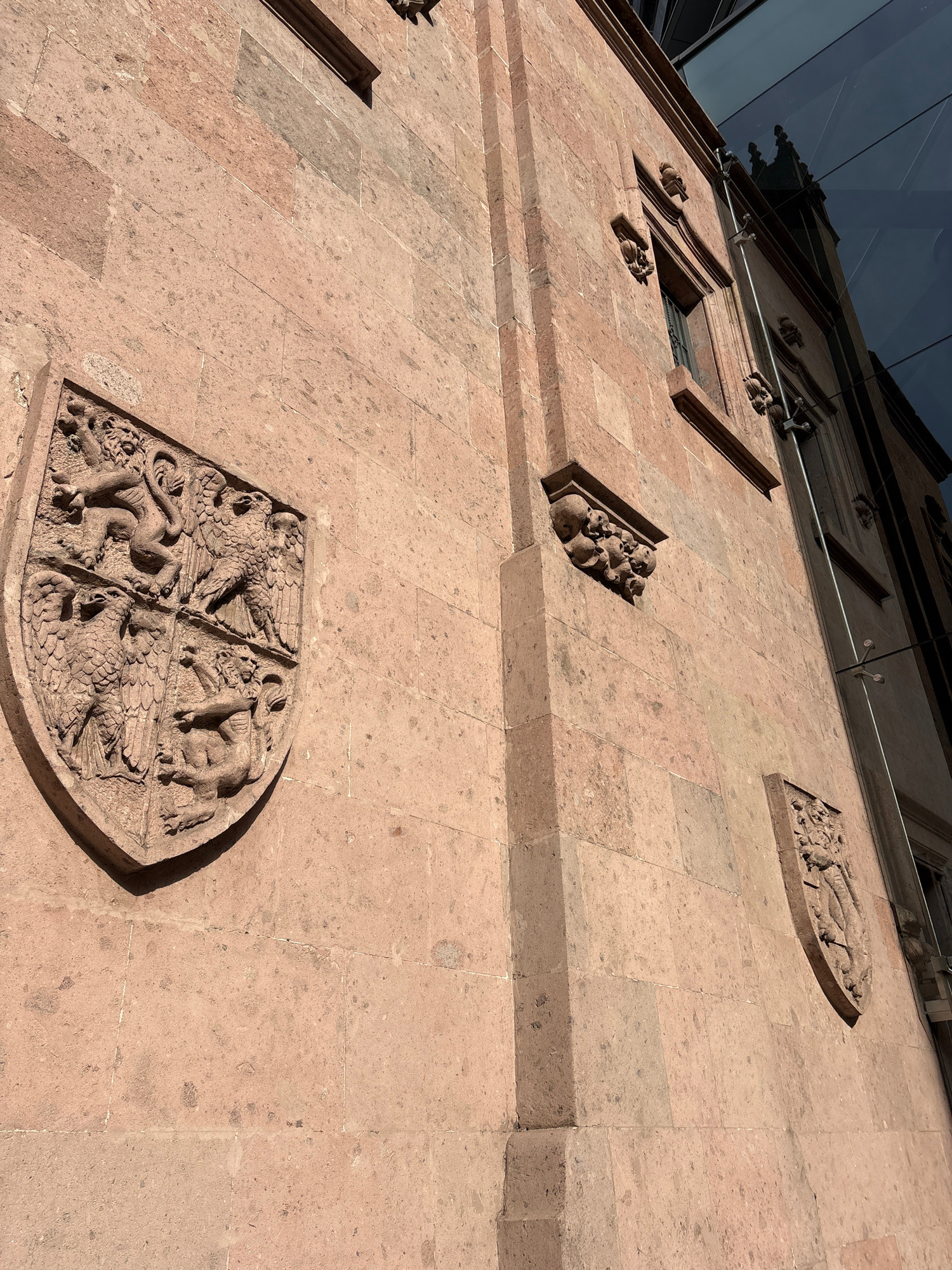 The image shows a facade of a building in Mexico City, Mexico. The building is constructed of light brown stone and features relief sculptures embedded in the walls. A large, shield-shaped sculpture d…read more