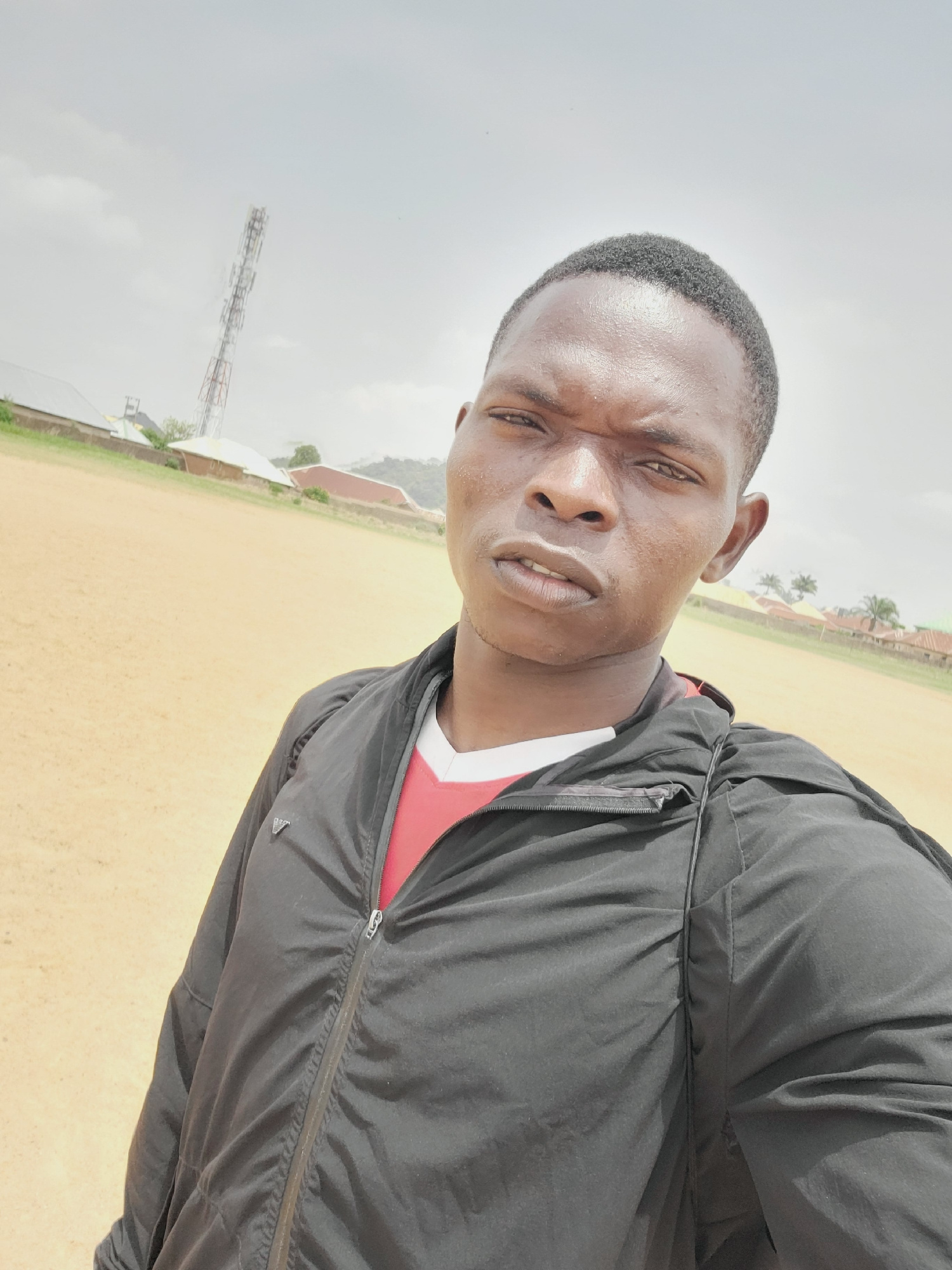 The image is a medium close-up selfie of a Black man with short dark hair wearing a black jacket over a red and white shirt. The background features a sandy field and a cloudy sky. In the distance, th…read more