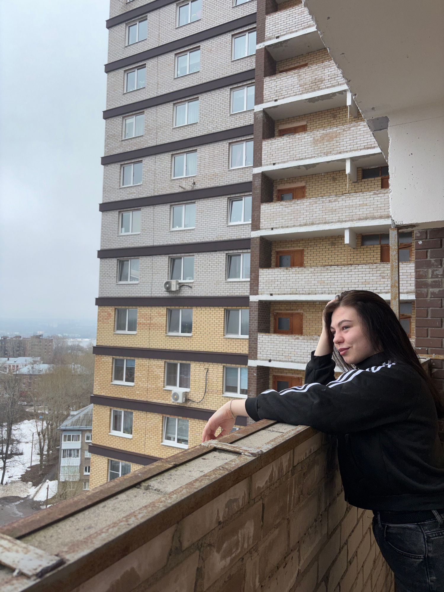 A young woman with long, dark hair is leaning on a brick ledge in front of a tall building. She is wearing a black jacket with white stripes on the sleeves and dark jeans. Her face is visible, and she…read more