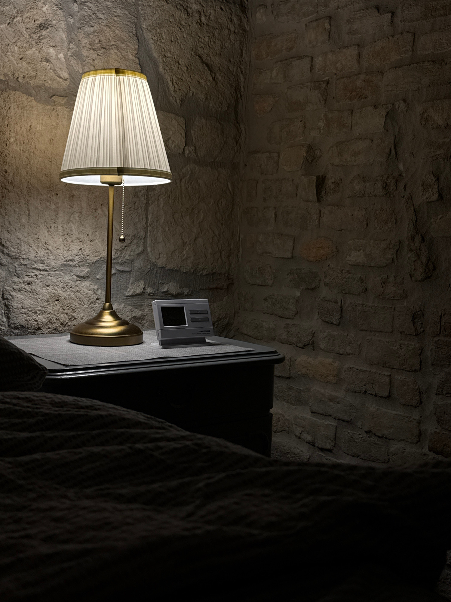 A wall-mounted lamp with a pleated lampshade illuminates a stone wall in what appears to be an interior setting. A thermostat is visible to the right of the lamp, mounted on a surface that might be a…read more
