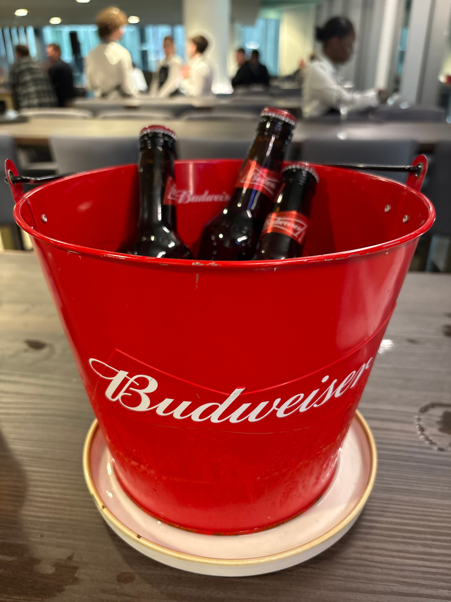 The image depicts a red Budweiser-branded bucket filled with bottles of Budweiser beer. The bucket sits on a wooden surface. In the background, blurred figures suggest a public space or restaurant set…read more