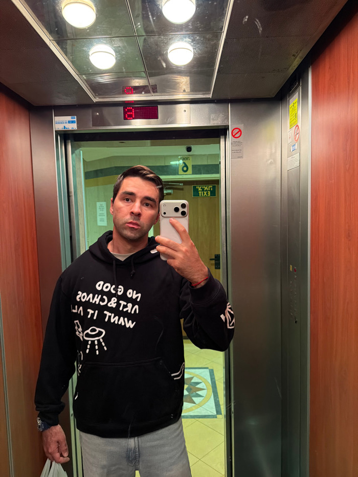 Inside an elevator, a man takes a selfie with his phone. The elevator's interior features metallic walls with circular lights and a digital floor display. The exterior behind the man is visible througβ¦read more