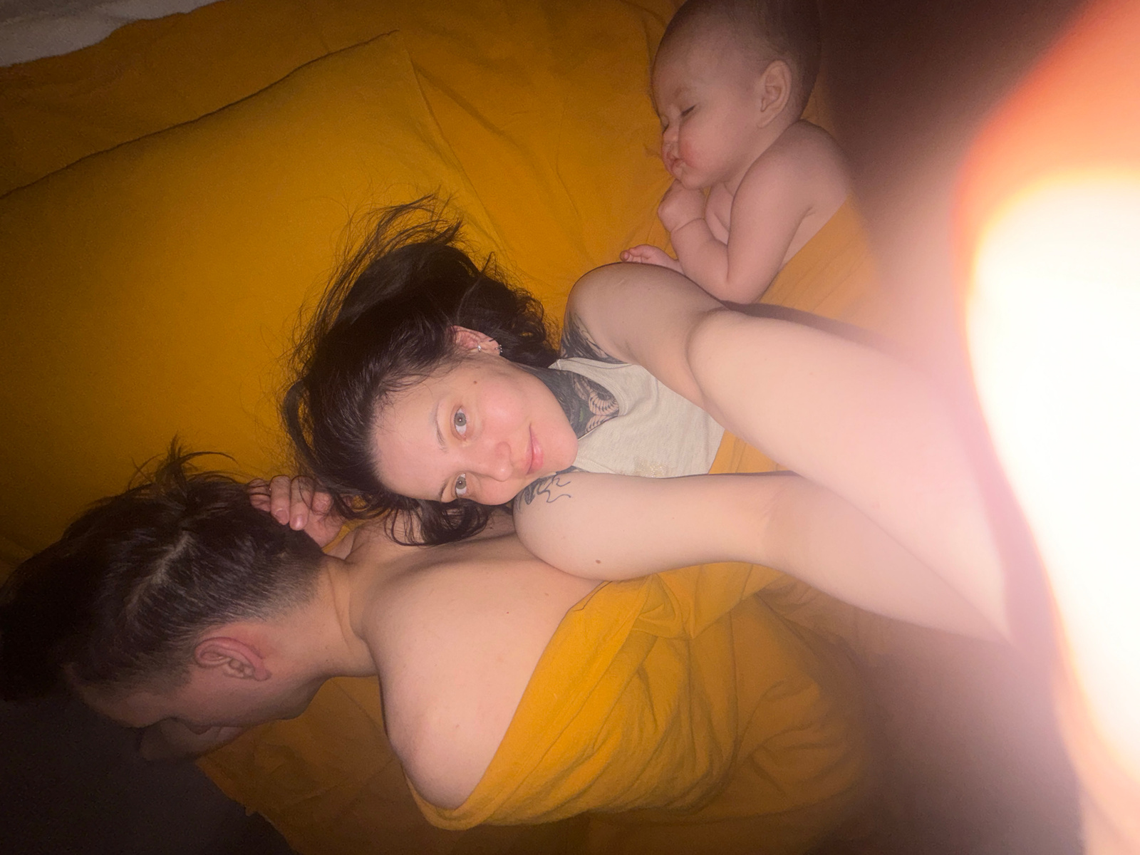 A photograph, possibly taken indoors in a private residence, features three individuals. At the bottom left of the frame, a person with short, dark hair is lying on their stomach, facing away from the…read more