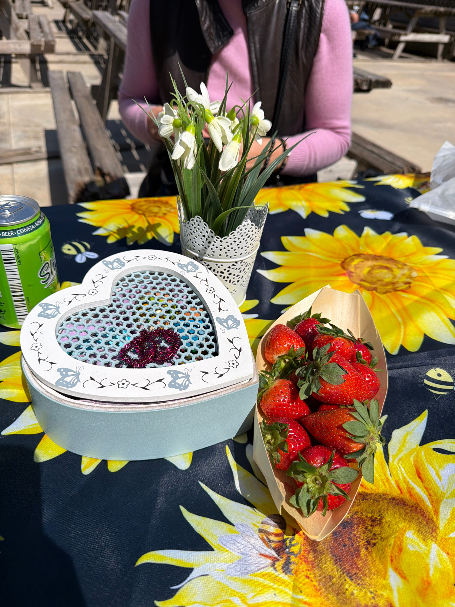 This image presents a vibrant outdoor scene, likely in Monistrol de Montserrat, Spain, featuring a collection of items on a table covered with a striking dark tablecloth patterned with large yellow su…read more