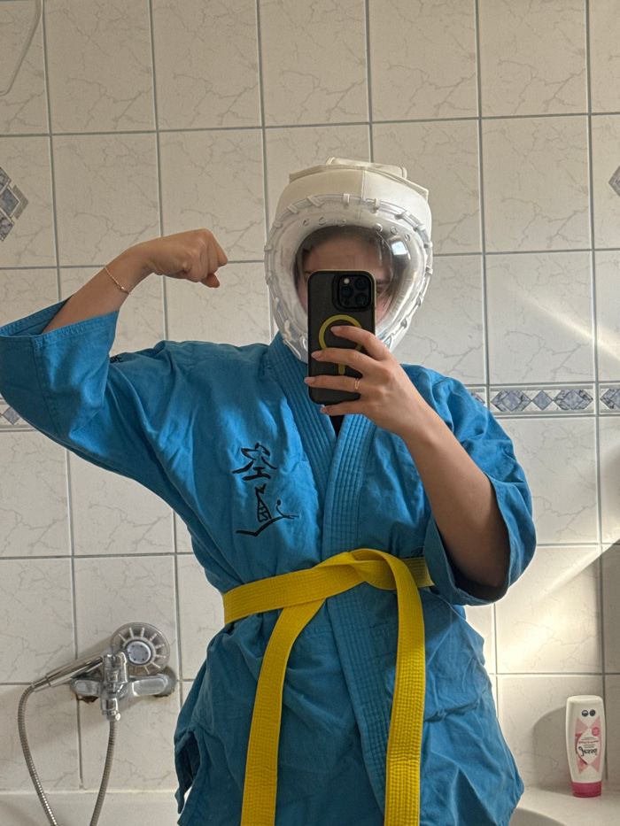 The image depicts a single individual in what appears to be a bathroom located in a private residence in Hainburg an der Donau, Austria. The walls are covered in white square tiles with grey grout, fe…read more