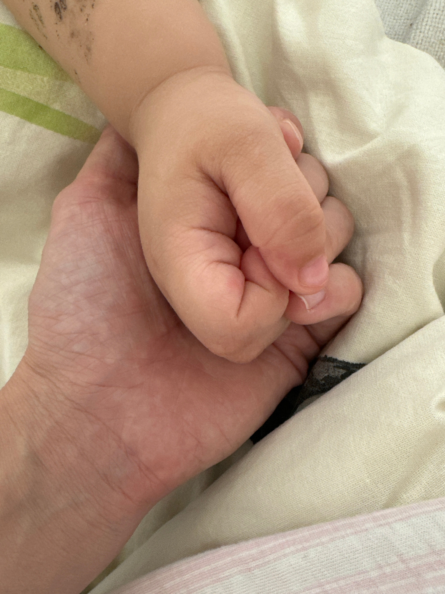A close-up shot shows a small child's hand clasped in an adult's hand, resting on a bed with striped bedding. The child's hand appears to be gripping the adult's hand tightly. The photograph was taken…read more