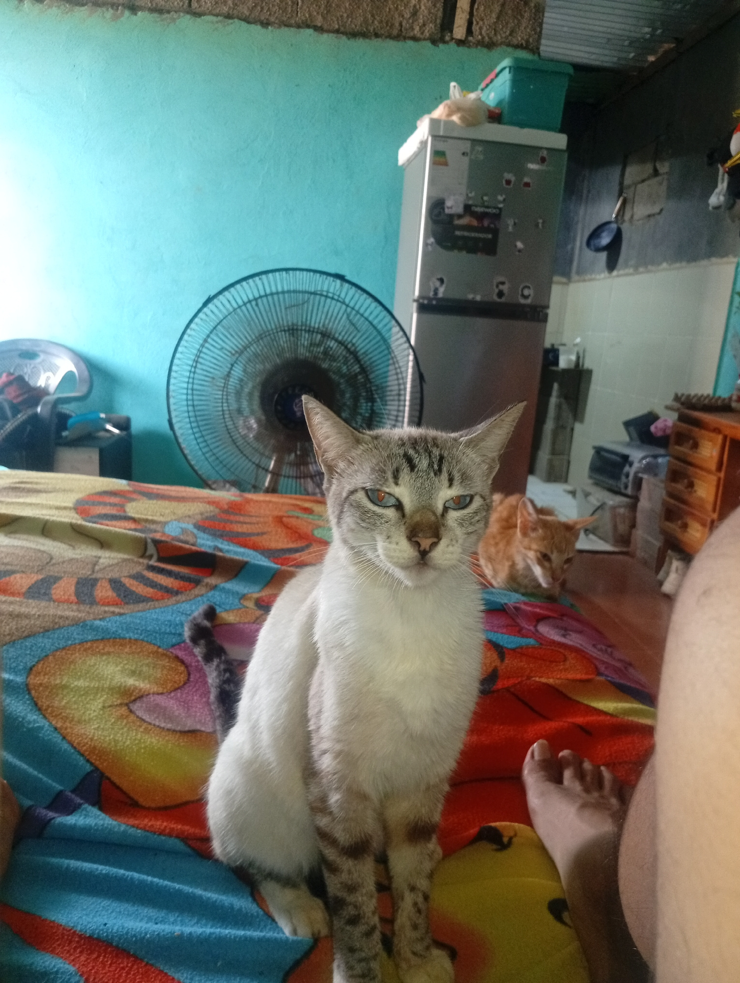 This image depicts a domestic interior in Altagracia, Venezuela. In the foreground, a domestic cat with a light grey and tabby patterned head, ears, and lower legs, and a white chest and belly, sits u…read more