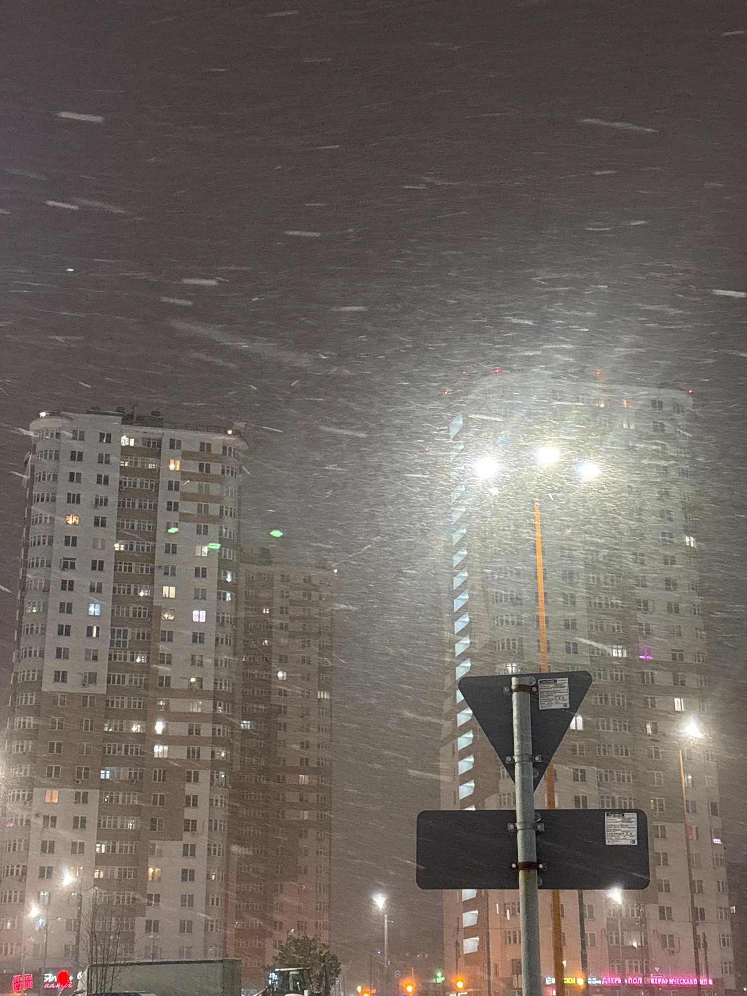 The image depicts a snowy night scene in Perm, Russia. Focus is on the road sign. Behind, tall buildings with numerous illuminated windows are visible. The heavy snowfall obscures the background detai…read more