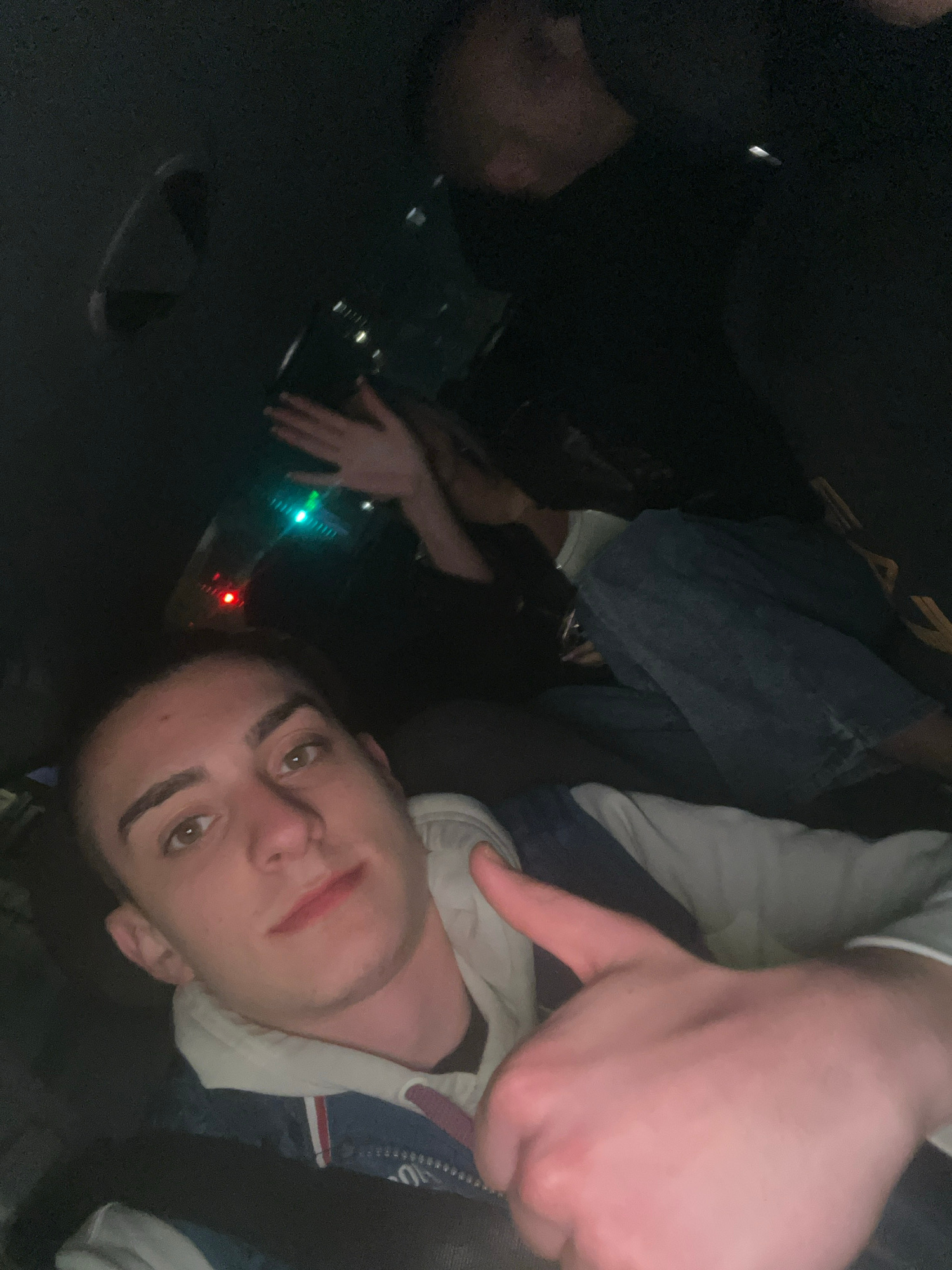 A photo taken inside a dark vehicle (possible limousine), containing at least three people. One man is visible in the foreground, angled towards the camera. The man has short brown hair, fair skin, anβ¦read more