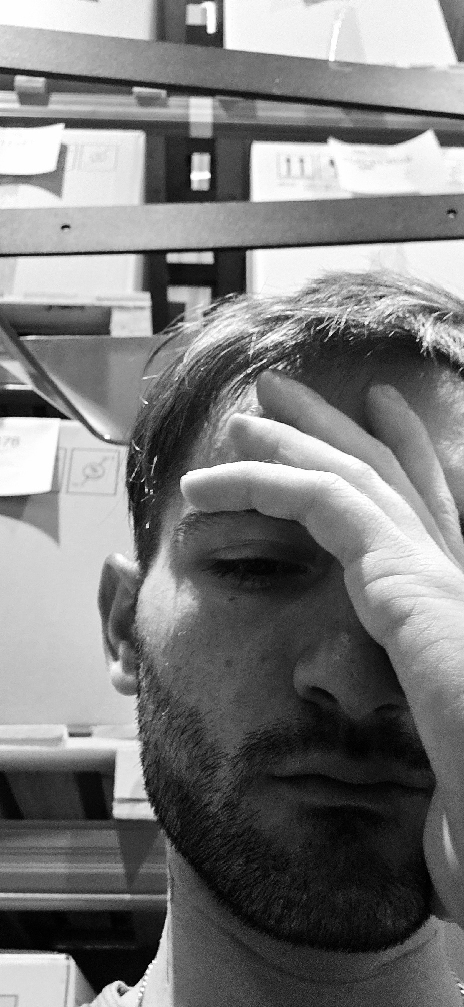 This black and white photograph presents a close-up, angled view of a person's head and hand, set in an indoor environment, possibly in Plovdiv, Bulgaria. The individual is positioned with their head…read more