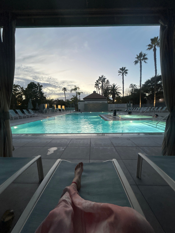 From a shaded area, a long turquoise pool reflects the colors of dusk under palm trees. Lounge chairs line the pool, with one partially occupied by someone wearing pink. Tiled decking surrounds the wa…read more