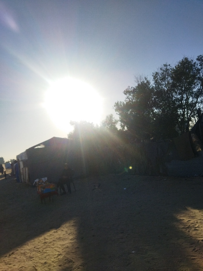 An outdoor scene in Khan Yunis, Palestinian Territory, is depicted under clear, intense sunlight, likely early morning or late afternoon, causing significant lens flare and overexposure from the sun p…read more