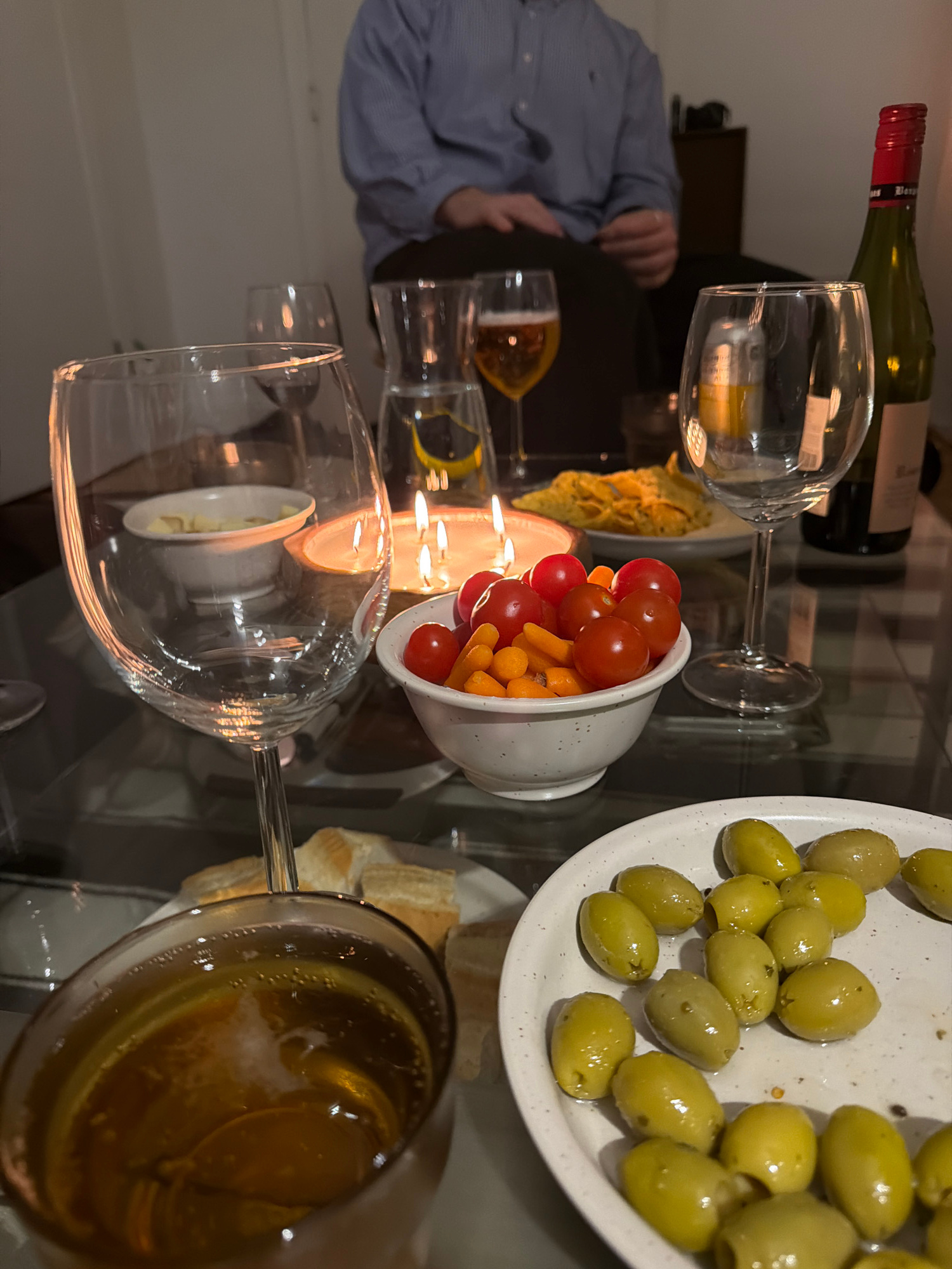 The scene depicts a still life arrangement on a reflective surface, possibly a glass table. Dominating the upper right is a plate filled with green olives. A small white bowl overflows with cherry tom…read more