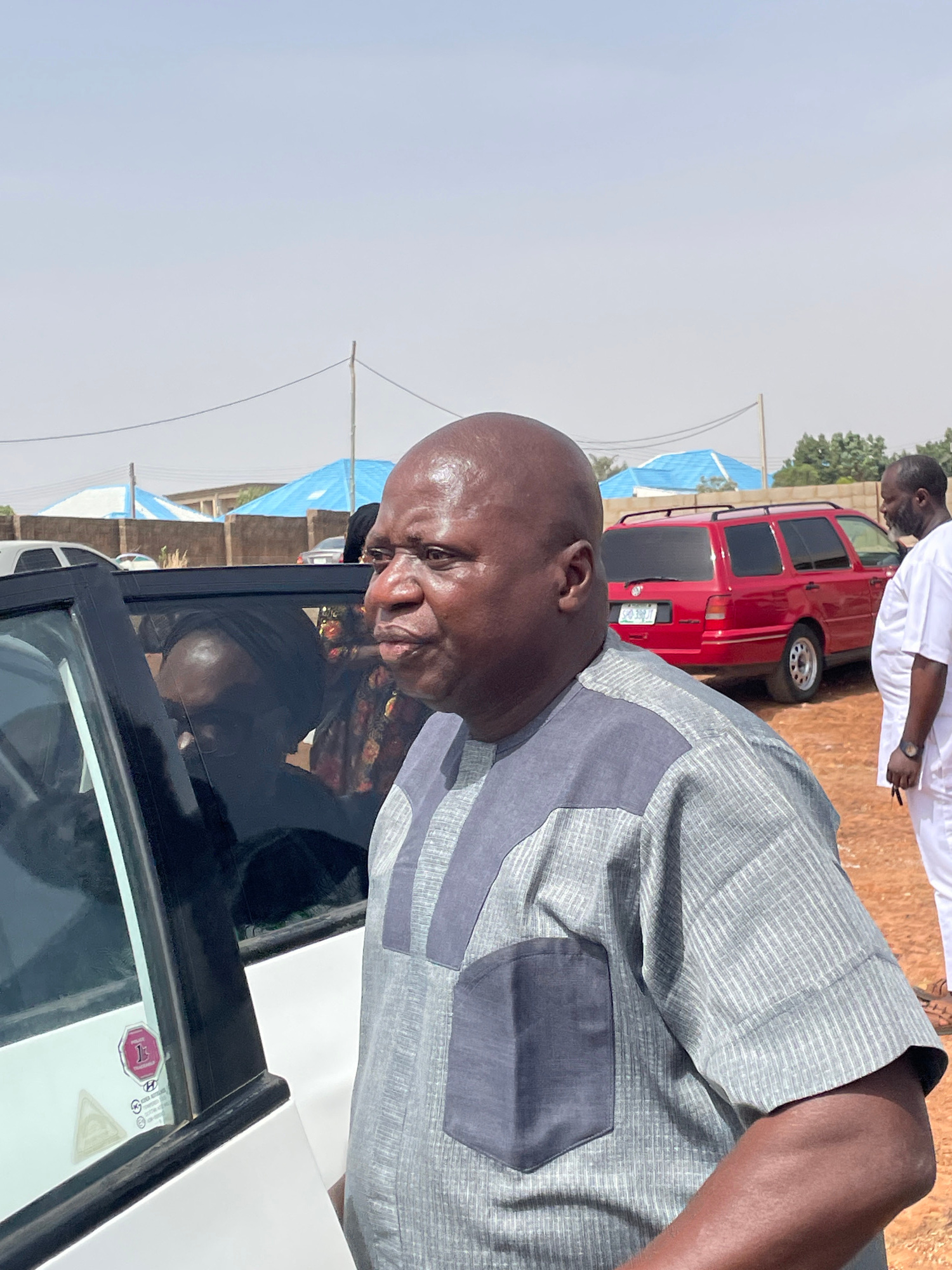 A man with a bald head, wearing a grey shirt with a dark grey pocket, is seen looking into the open driver's side window of a white vehicle. Another person is in the driver's seat. Outside the car, th…read more