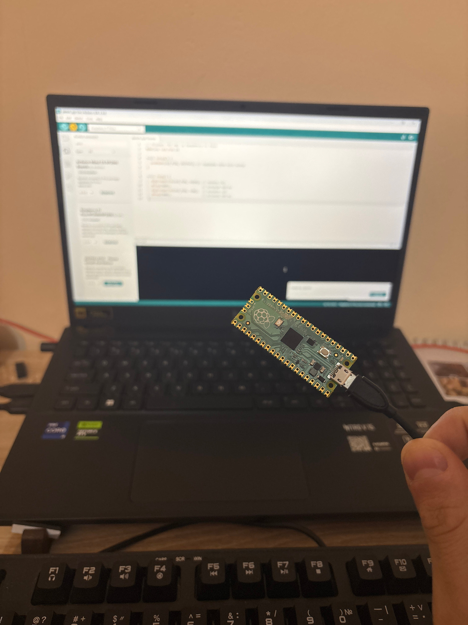 The image shows a person holding a Raspberry Pi Pico microcontroller board connected to a USB cable. The board is positioned in front of a laptop screen displaying what appears to be the Arduino IDE.…read more