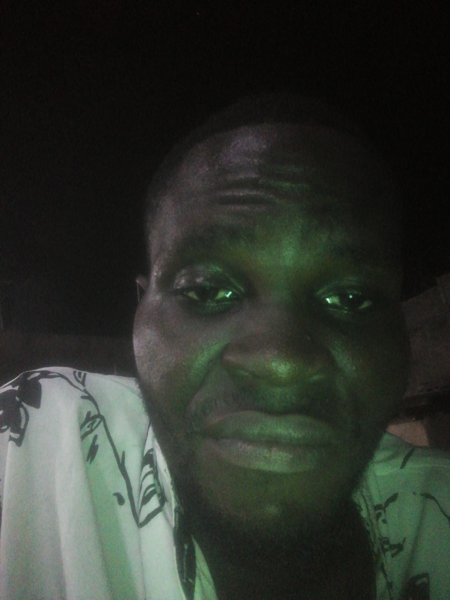 A close-up selfie shows a dark-skinned man in dim lighting. He has a shaved head and dark eyes. He is wearing a white shirt with black floral designs. The background is dark. No specific details indicβ¦read more