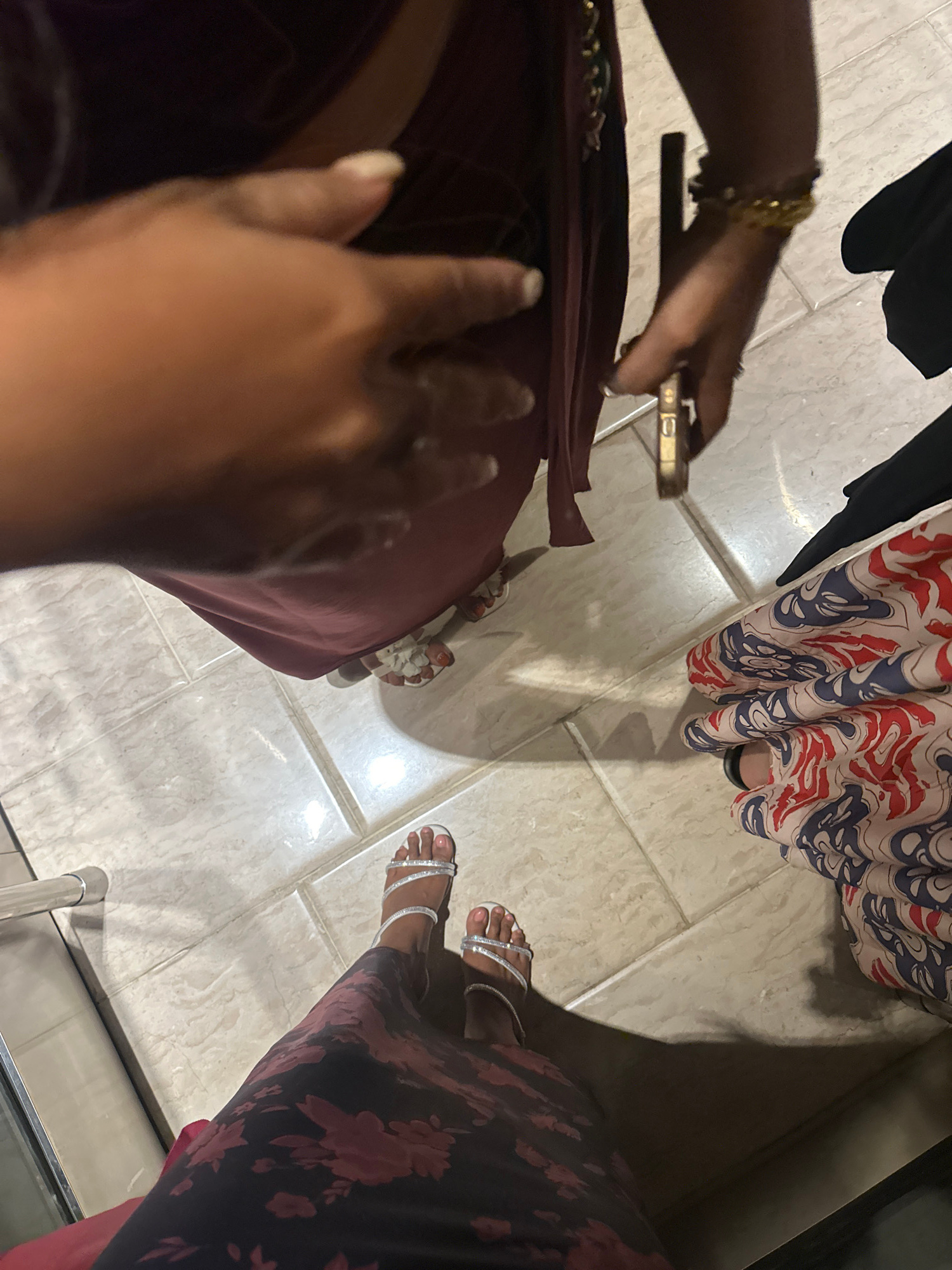 This high-angle image captures an indoor scene in Kuta Selatan, Indonesia, focusing on the lower halves of several individuals on a light-colored, possibly beige or grey, tiled floor. The floor tiles…read more