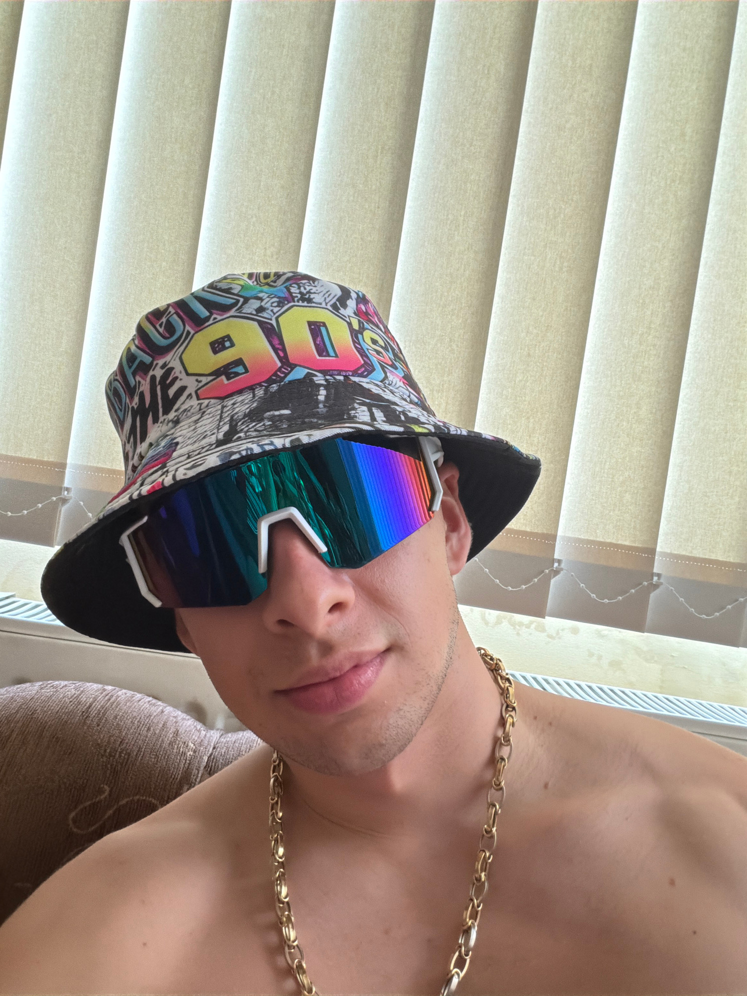A person wearing a bucket hat, sunglasses, and a gold chain is posing in front of a window covered with blinds. The individual is facing the camera with their head tilted to the left. The bucket hat h…read more