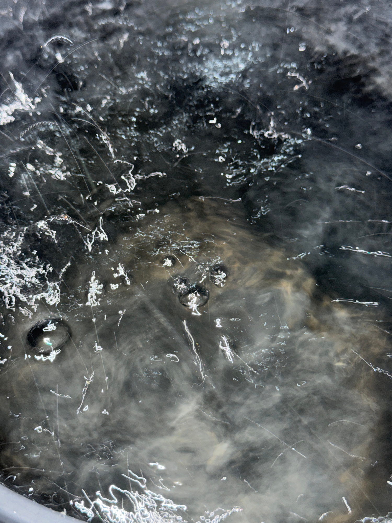The image presents a macro view of what appears to be a murky liquid surface, possibly water, with a mix of dark and light tones. Streaks, swirls, and tiny air bubbles are visible, creating a dynamic…read more