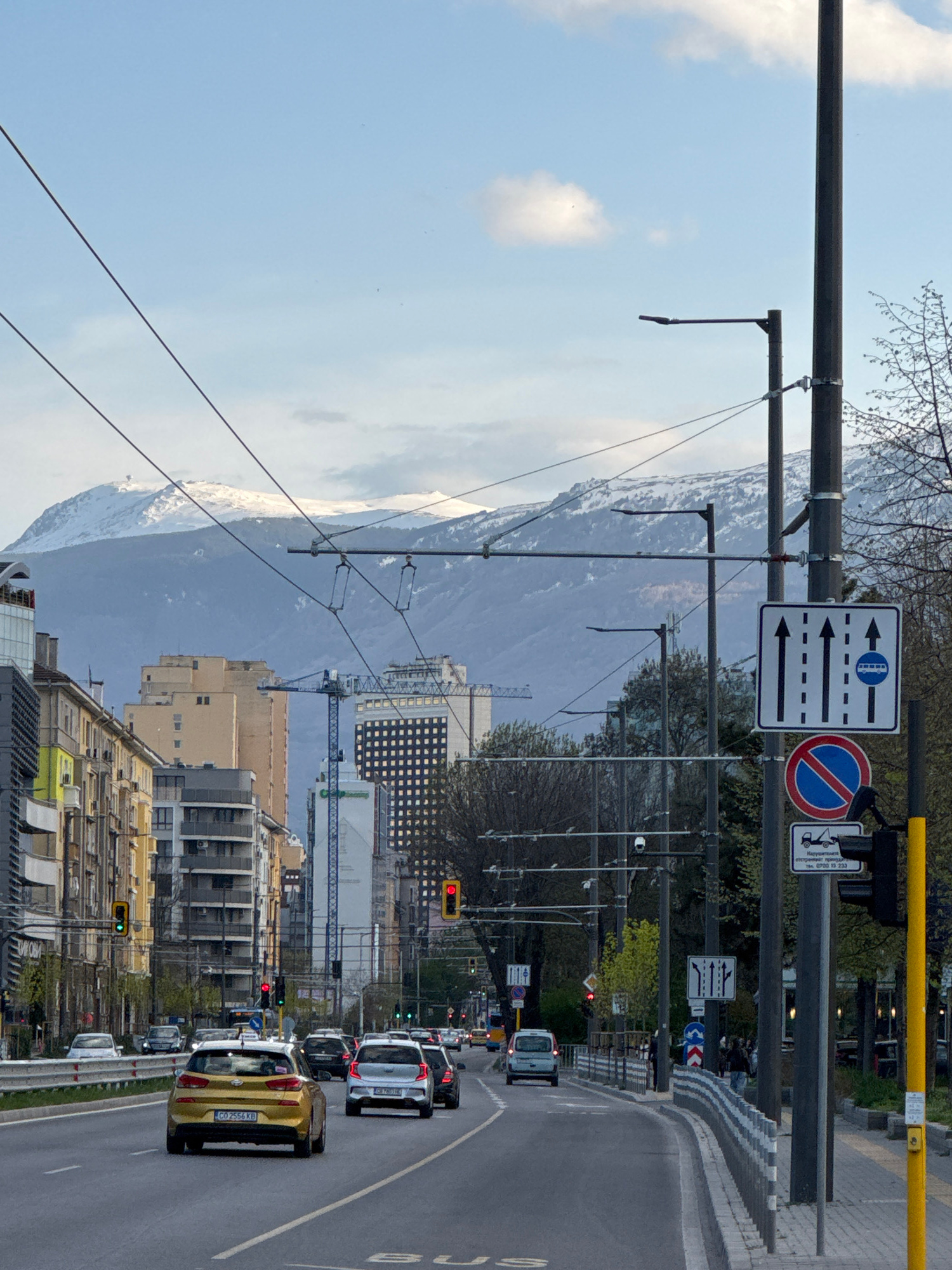 The image shows a street in Sofia, Bulgaria with several cars moving along it. A mountain is visible in the background. There are overhead power lines and traffic lights. Street signs are present. Bui…read more