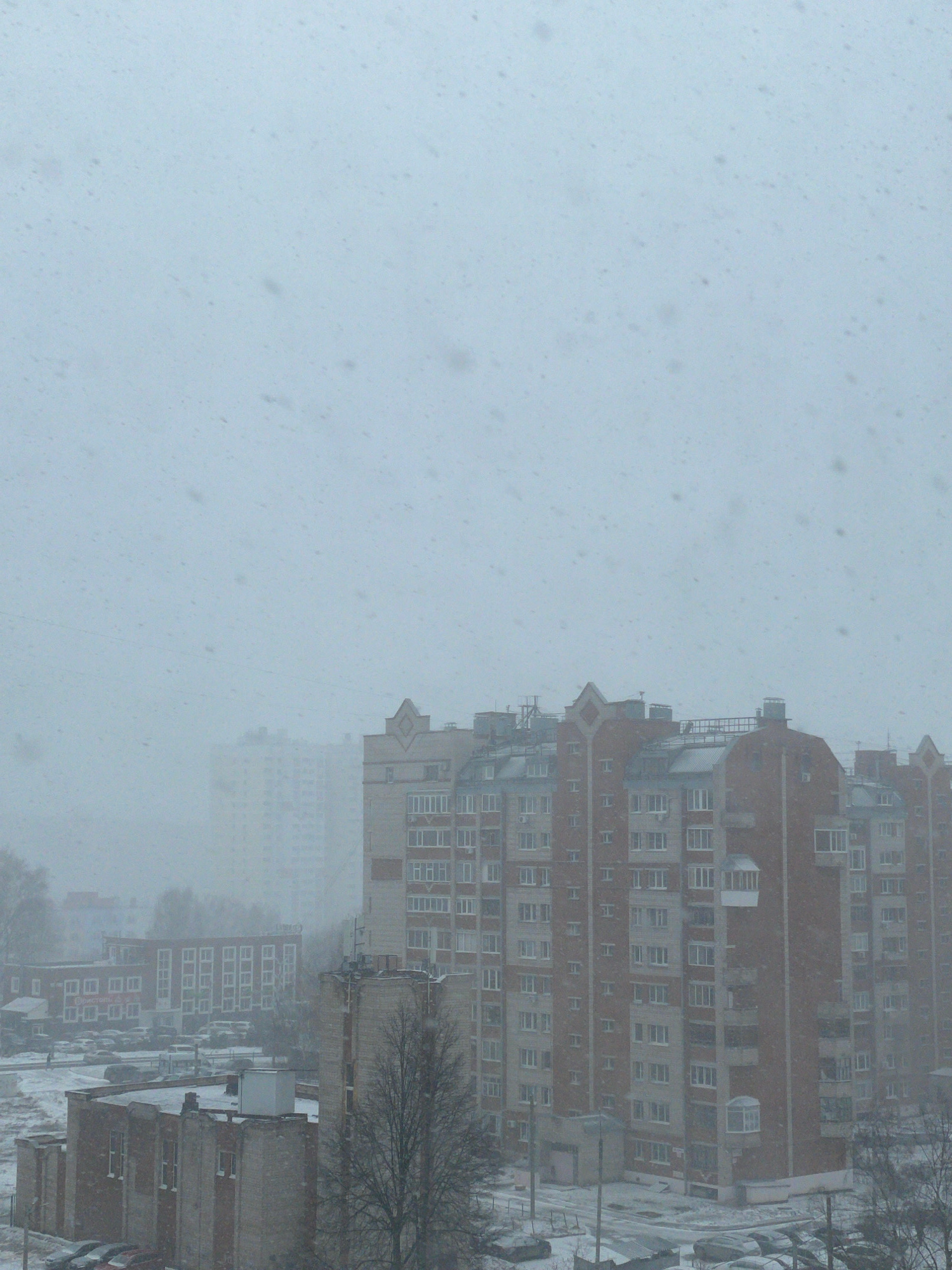 The image depicts a snowy day in Izhevsk, Russia, with the presence of residential buildings. The buildings are brick and multi-storied, with numerous windows. Snow is falling heavily, creating a hazy…read more
