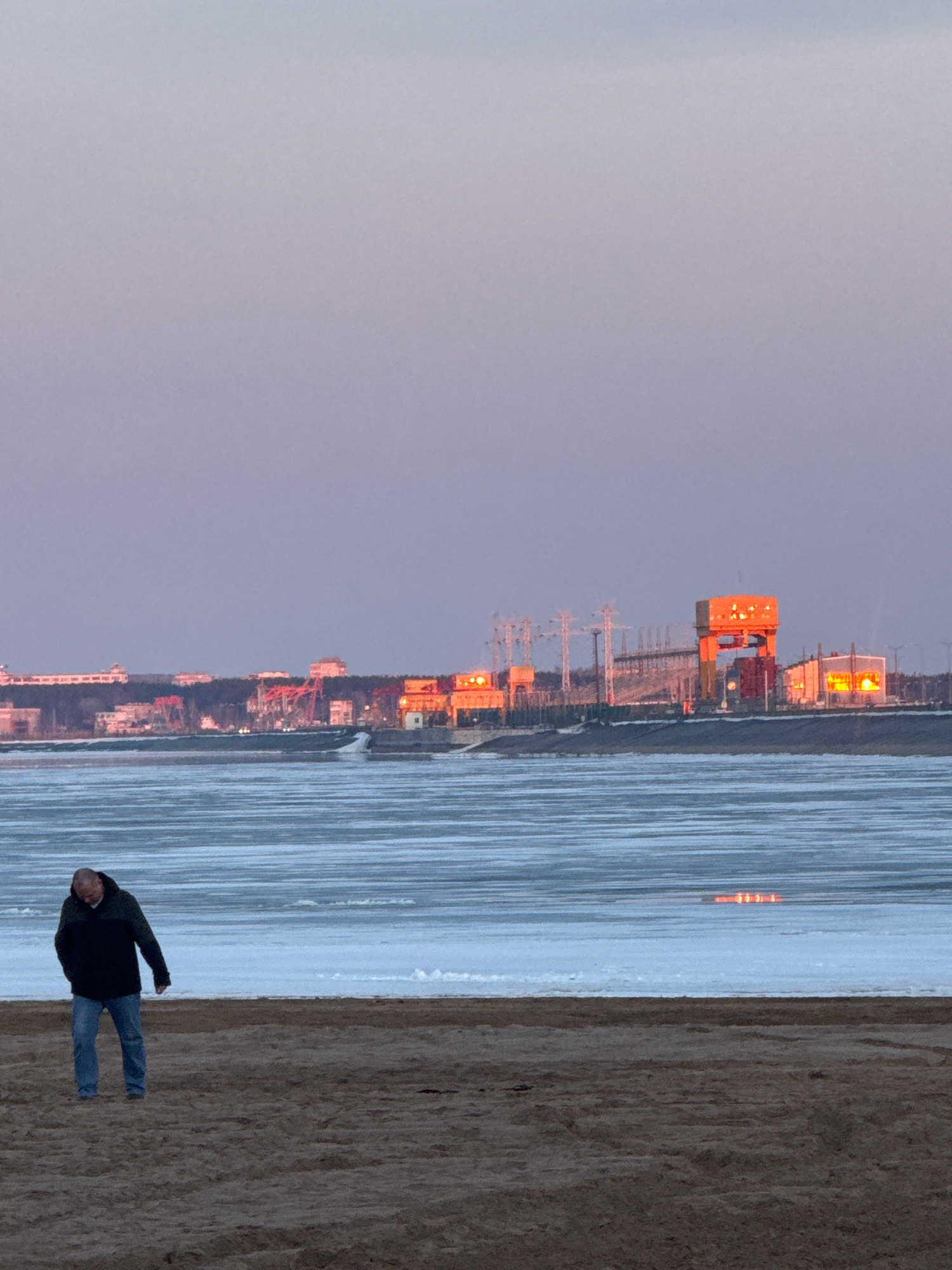 The image depicts a man standing on a sandy beach next to a body of water that appears to be ice-covered. In the background, there is an industrial area with structures and cranes illuminated by orangβ¦read more