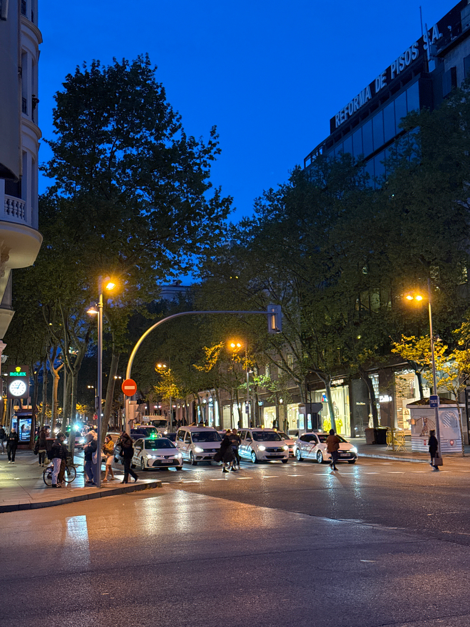 The image depicts a nighttime street scene in Madrid, Spain. The camera is positioned at street level, capturing a view along a wide avenue lined with trees and buildings. The sky is a deep blue, indi…read more