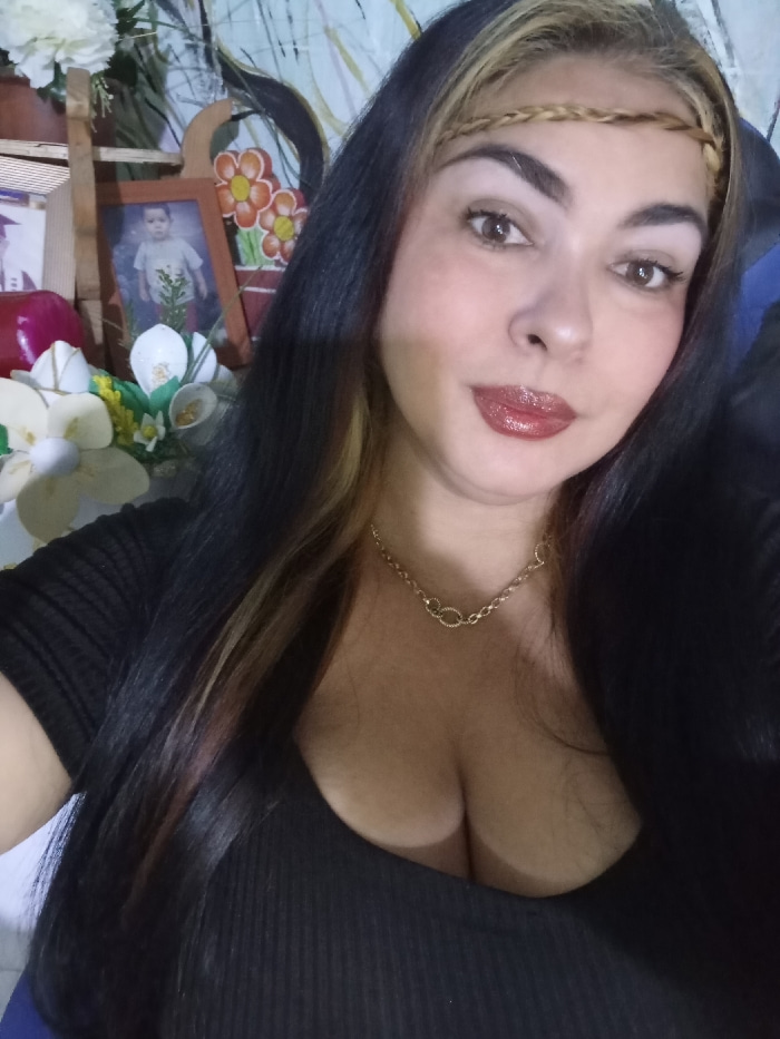A woman with long dark hair and a braided headband poses for a selfie. She has fair skin, dark eyes, and wears a shiny dark red lip color. A gold necklace adorns her neck. She wears a black low-cut toβ¦read more