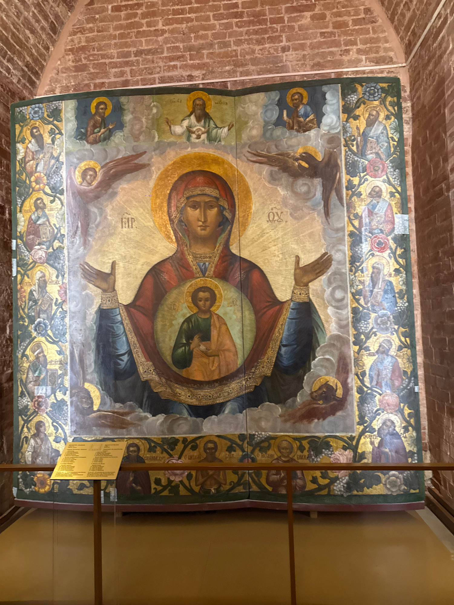 The image depicts a large Orthodox icon, likely the "Sign" icon of the Theotokos (Virgin Mary), displayed within the interior of a building with brick-vaulted ceilings, suggesting an older structure,…read more