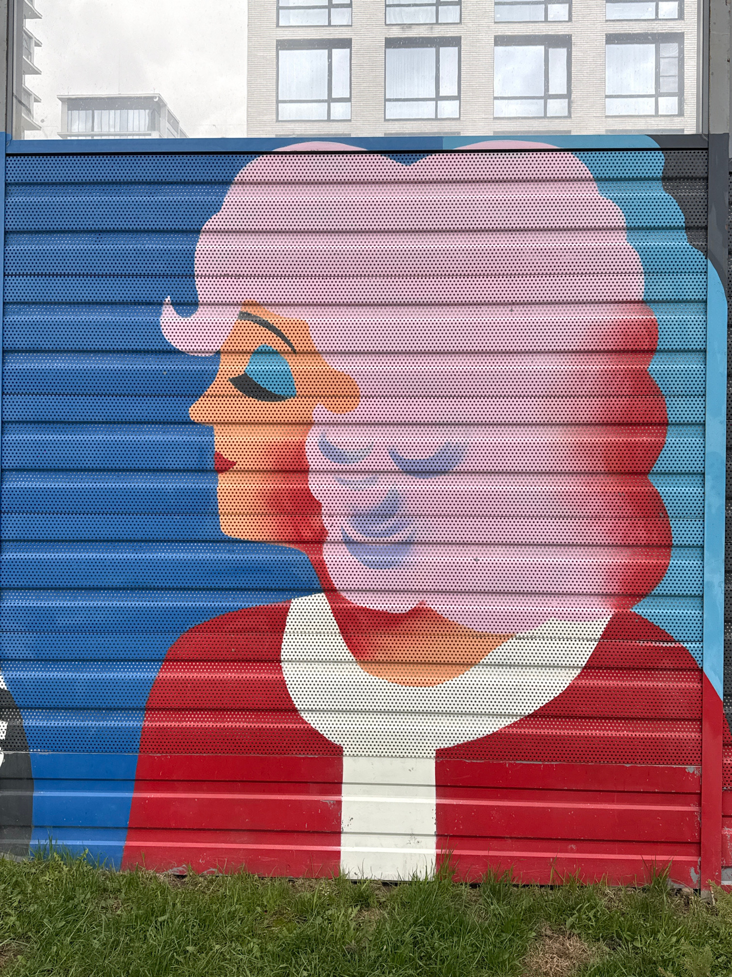 A metal fence or screen, comprised of vertical corrugated panels with a consistent perforation pattern, displays a colorful, stylized mural. The mural depicts a human figure, possibly a child, lying o…read more