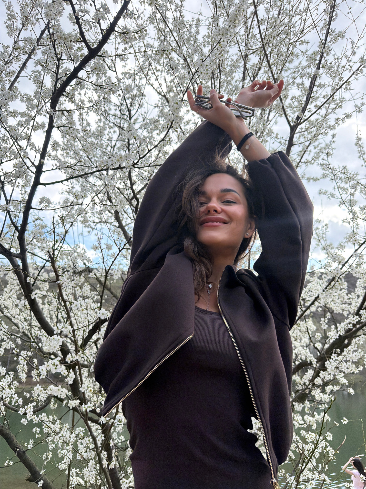 The image shows a young woman from a low-angle perspective, looking up towards her, positioned against the backdrop of a blossoming tree and a body of water. She is wearing a dark brown, possibly ribb…read more